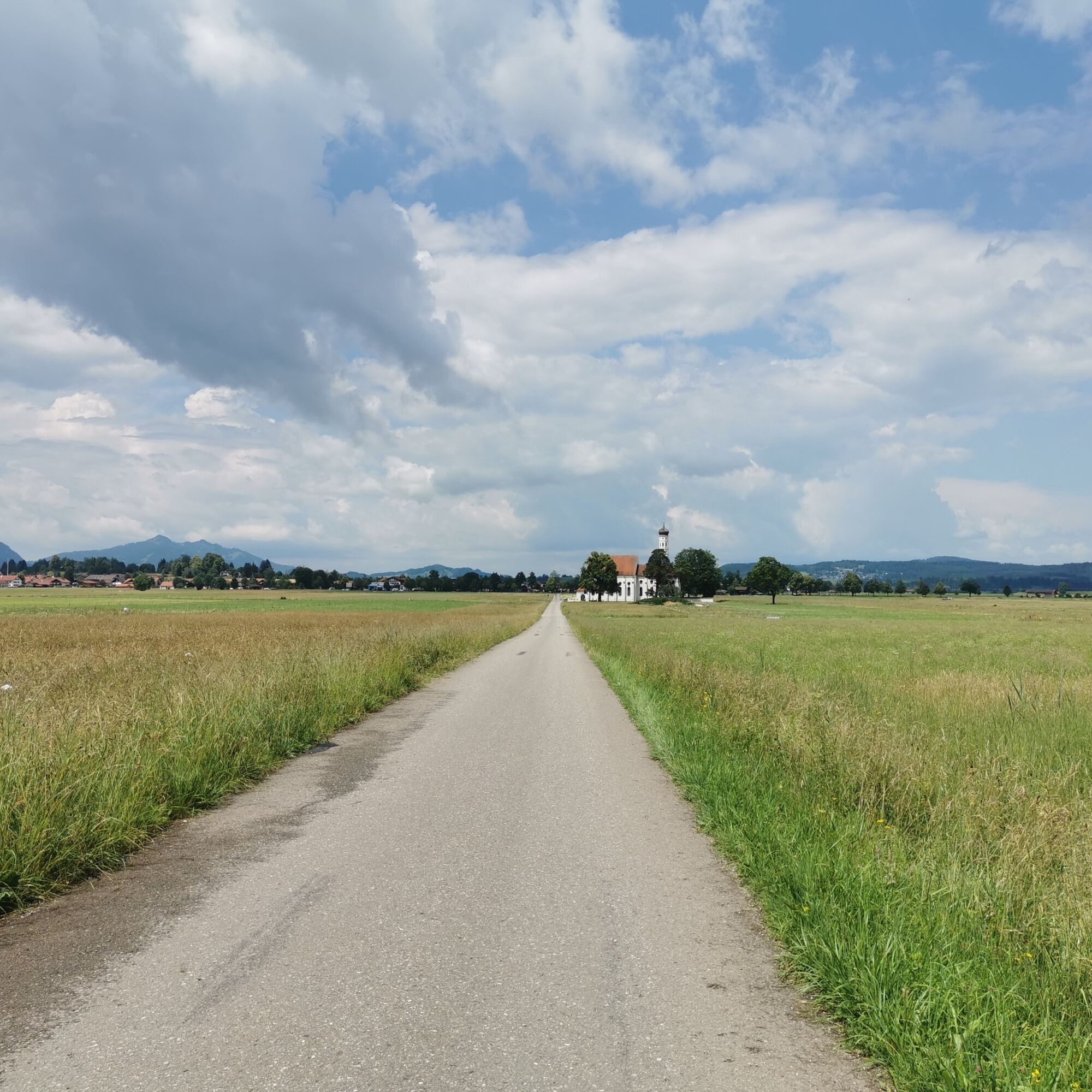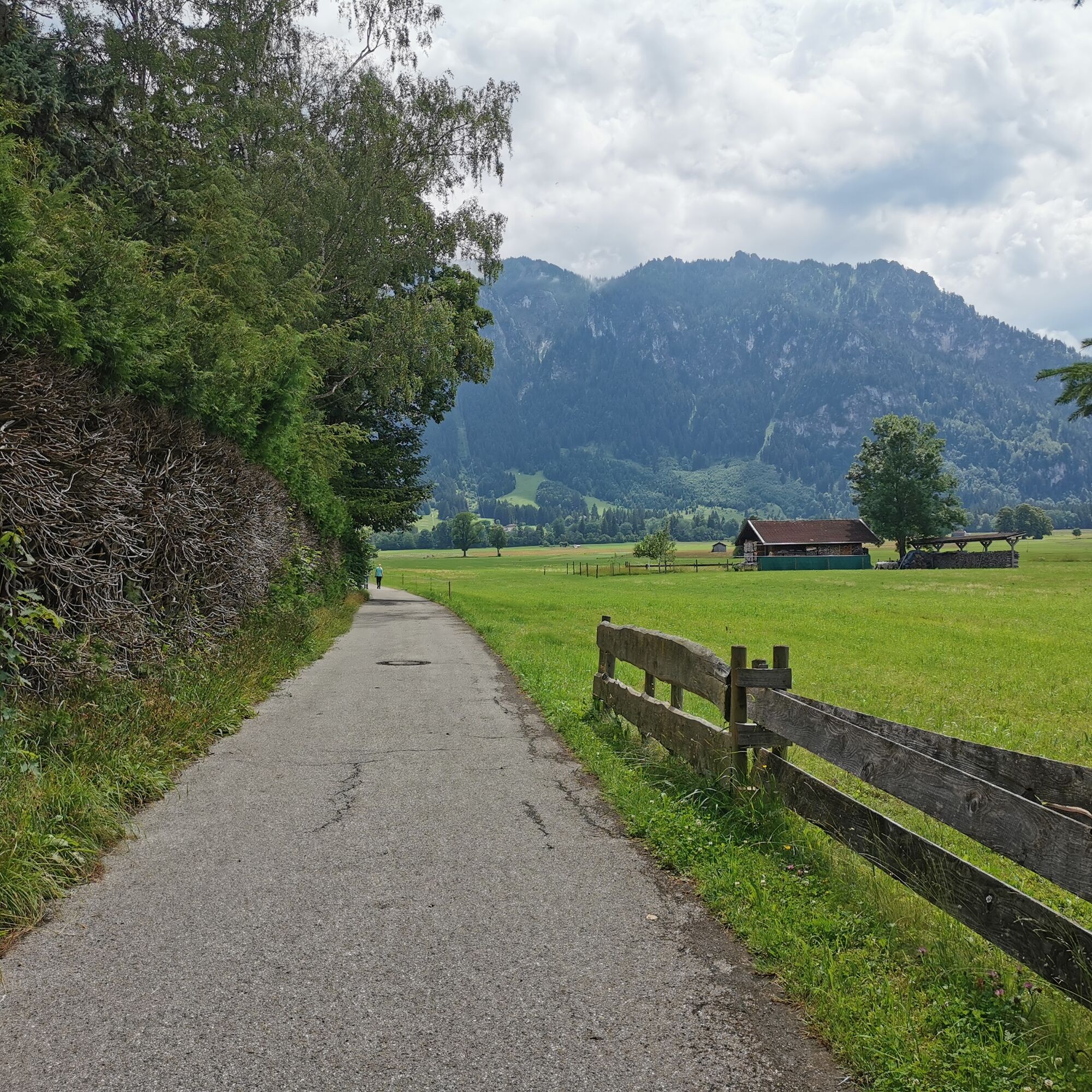 The easy circular hike starts at the parking lot of the Tegelbergbahn Schwangau. There you will find disabled parking spaces and disabled toilets. The tour starts from the parking lot in the direction of Schwangau. Here you walk downhill for 0.5 kilometers, 20 meters in altitude (gradient 4%). After passing a wide wooden bridge, turn right and walk along the gravel path alongside the "Pöllat" stream. After about 600 meters, the path crosses a tarred road with little traffic. Shortly before this, the gravel path descends a little. The circular tour then turns left onto the tarred road, which leads directly to the pilgrimage church of St. Coloman. You will reach the church after about 500 meters. There are benches to rest on. After a short rest, the route continues to Schwangau. On the cycle path along the B17, you come directly into the village and onto the sidewalk there. Stay on this path until you reach the town hall. Turn left into the Deichelweg and walk along it. You can enjoy the breathtaking view of the Schwangau mountain scenery and the royal castles of Neuschwanstein and Hohenschwangau from a bench along the way. Follow the Deichelweg along this wonderful view until you reach the end and turn left onto the footpath. After a few meters, cross Colomanstraße and follow the path next to the road back to the starting point. Here the route climbs another 20 meters over 0.5 kilometers.