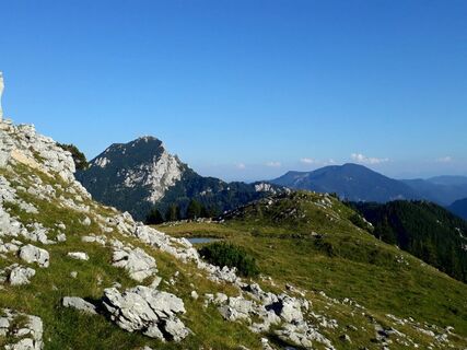 An der Alm angekommen geht es weiter den Berg hinauf in Serpentinen immer dem steilsten Weg folgend. Dieser führt uns nach einem Wäldchen auf eine schöne Alm und dem ersten Gipfel zur Linken. Der Bockstein mit 1575hm. Wir gehen wieder ein Stück hinunter und dann an einem kleinen Teich vorbei leicht nach links den Grad hinauf. Dann kommt schon das Gipfelkreuz in Sicht und wir sind auf dem Breitenstein mit 1622hm.