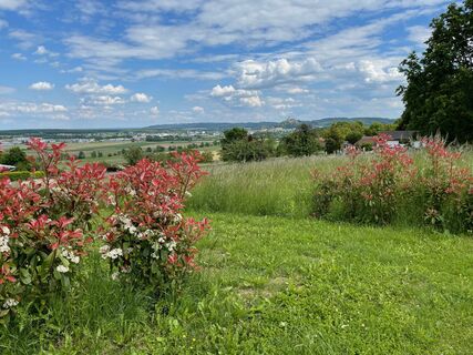 Aber - oben in Rosenberg angekommen wird jeder der durchhält mit einem wunderbaren Panorama auf die Burg Güssing samt Fischteich belohnt. Herrlich. Natürlich mit einem gemütlichen Bankerl zum Rasten.