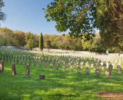 We are now at the edge of the Karst escarpment, the Gulf of Trieste/Trst, the final stage of the Walk of Peace, stretches out and comes into view at the edge of the numerous points of interest this time linked to the Austro-Hungarian army engaged in defending the city of Trieste, the main port on the Adriatic of the empire. The Italian army, despite numerous attempts, never succeeded in taking possession of these territories before the end of the conflict. Remains from the First World War and cemeteries dot this last part of the route immersed once again in the green and rugged beauty of the Karst escarpment. The immense turquoise expanse of the sea arrives, calmly, only at the end, when you start the descent to reach the white Miramare Castle and its protected marine reserve.