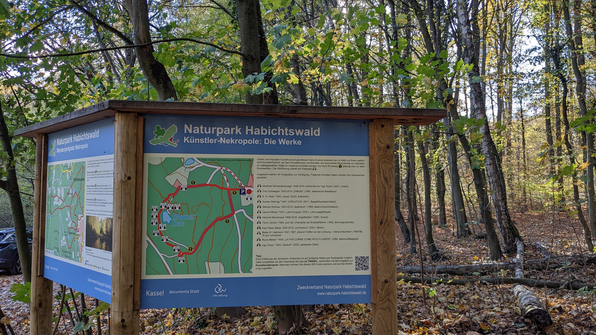 Initiiert vom Kasseler Kunsthochschulprofessor Harry Kramer entstand der im Wald vor Ihnen befindliche Künstlerfriedhof, auf dem Künstlerinnen und Künstler von documenta-Rang bereits zu Lebzeiten an selbstgewählter Stelle ihr Grabmal errichten können. Auf dem Rundweg 1 um den Blauen See herum, gelangt man zu allen Kunstwerken.