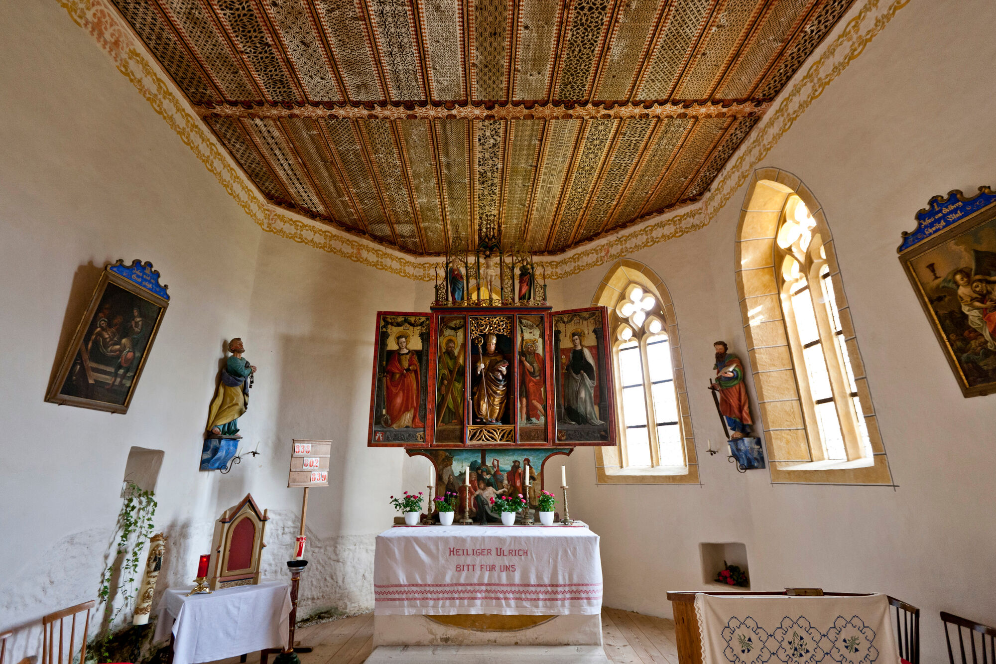 The church of St. Ulrich at the entrance to the Etrachtal, which dates from the end of the 15th century and is one of the few Gothic country churches. No structural changes were made over the centuries. The late Gothic church of St. Ulrich am Hollerberg, at the entrance to the Etrachtal, dates from around 1500 and has been preserved almost unchanged. You will find here a painted wooden beam ceiling of the early 16th century.