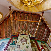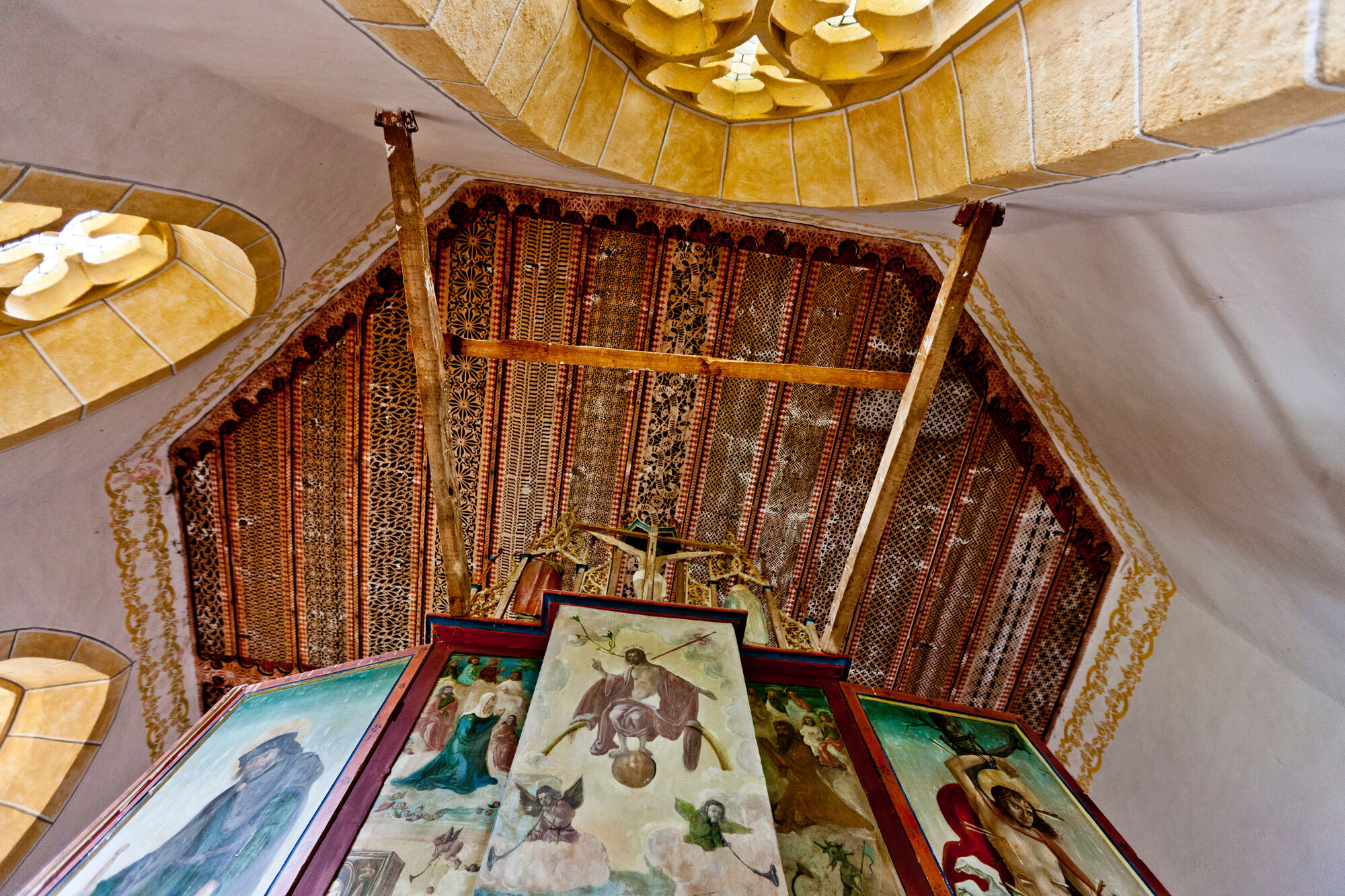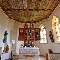 A special feature of the church are the painted wooden ceilings of the choir and nave, which consist of simple longitudinal boards with interposed moldings. The moldings were richly decorated by stencil painting and script bands. In addition to simple geometric latticework, fish-bubble tracery, delicate rosettes and tendrils with flowers dominate the appearance. The characteristics of the small-scale painting point to the foothills of the Gothic period around 1500. The high altar is a late Gothic winged altar with a central shrine, predella, and sprinkling on top. It depicts the Lamentation of Christ. The altar, completed in 1521, was replaced in 1741 by a new creation of the Judenburg sculptor Balthasar Brandstätter. The church walls are decorated all around with figures of saints and images of the Passion.