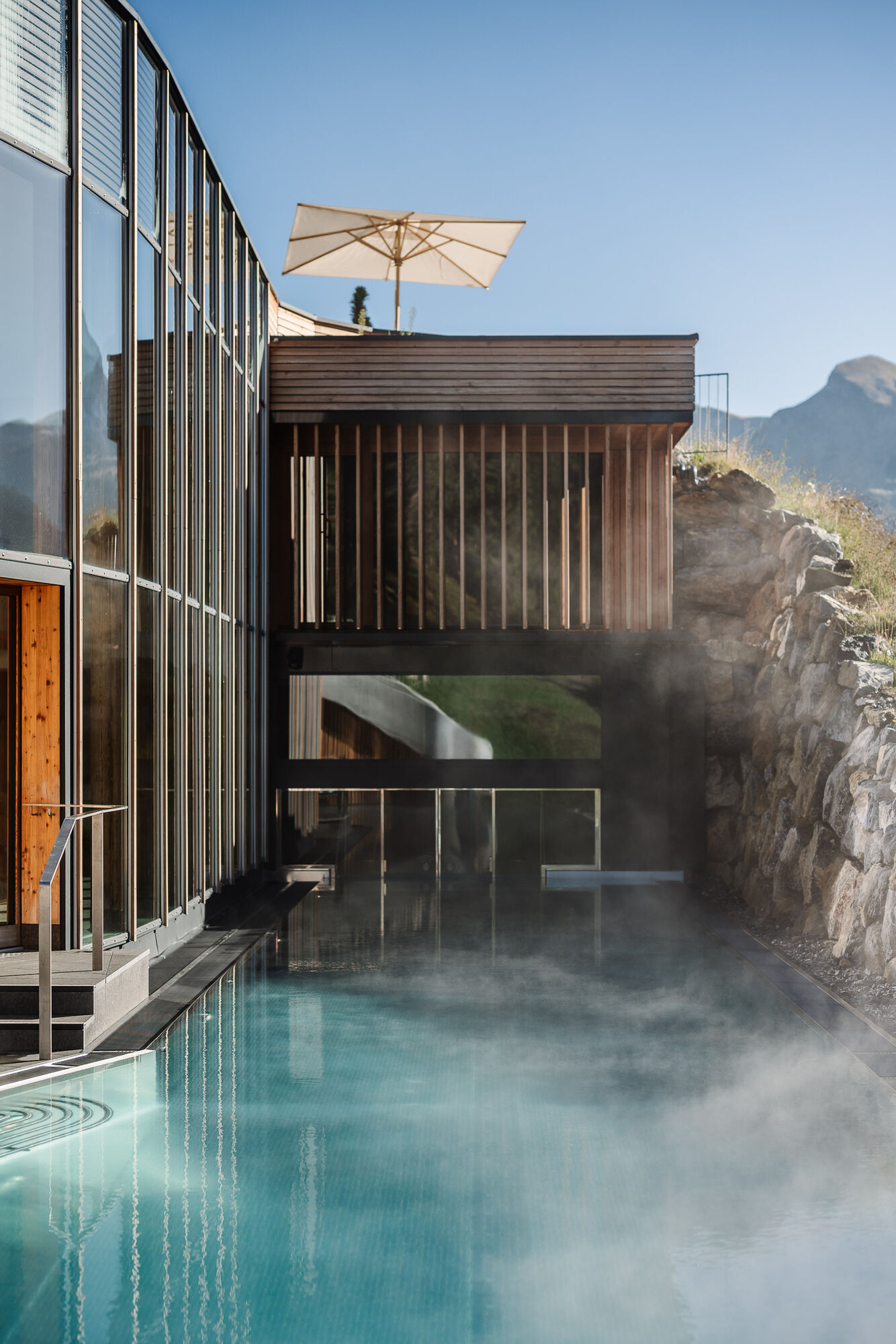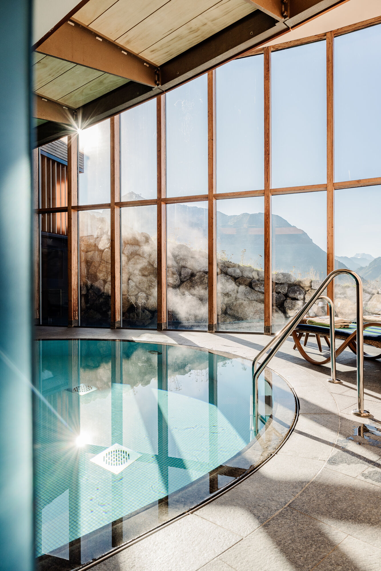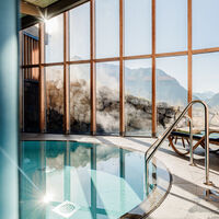 Our Alpine Spa, renovated in 2024, not only impresses with vigorous swims in the 23-metre-long outdoor infinity pool with whirlpool function. You also have the choice between three large saunas, some with a wonderful view of the mountains. There is also a mountain cave pool terrace and indoor pool, also with a magnificent view of the Omeshorn, the local mountain. The extended relaxation rooms also look in this direction and the Swiss stone pine room in particular increases the level of relaxation thanks to the delicate scent of this wood. The fitness room and adjoining yoga and meditation room offer space for conscious movement.