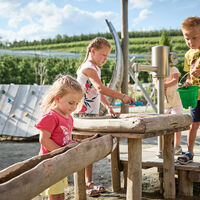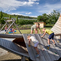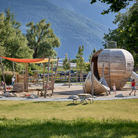 The Apfelgarten playground is a favorite spot for families vacationing in Natz-Schabs. Children can let off steam on the various play equipment. They can climb up the five-meter-high wooden apple and slide down, splash around in the large water play area with a mud zone on hot summer days, jump on the trampoline, and bounce on the wooden animals. Covered benches and wooden decks offer perfect spots to rest and enjoy a picnic.