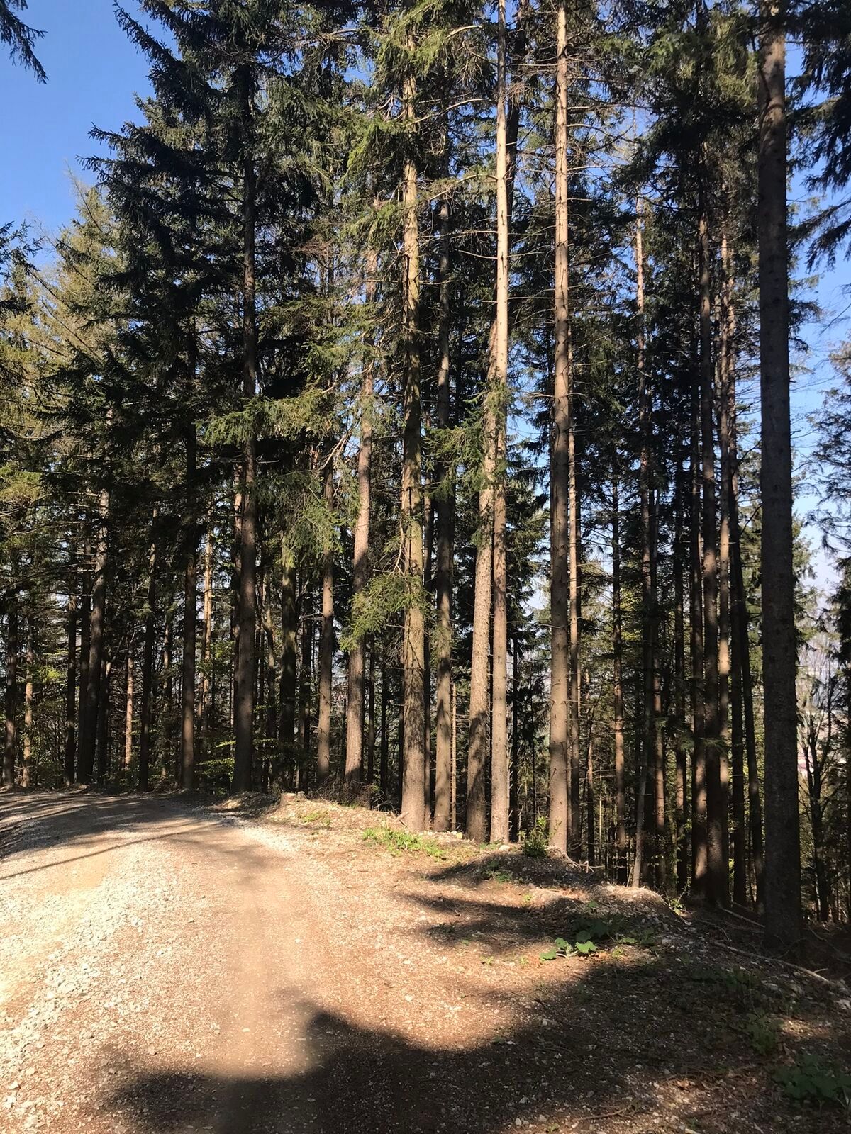 The singletrail downhill starts directly next to the uphill and leads through the forest. We cross the forest road several times (please watch out for other vehicles), at times also follow the forest road, and after the last section of the trail, continue back on the forest road to the parking lot.