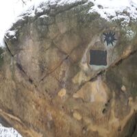 Wanderstart ist einer Kurve neben der L2010 (Beschilderung hängender Stein)