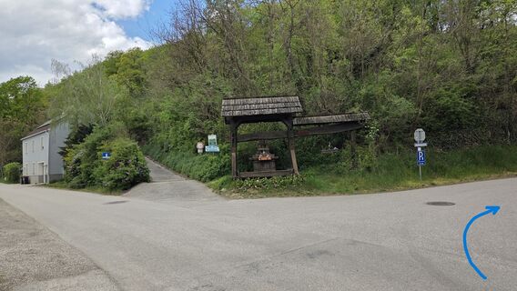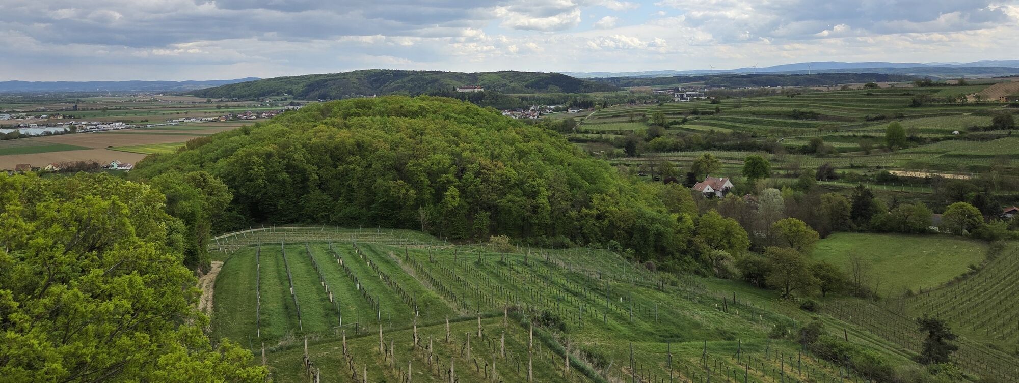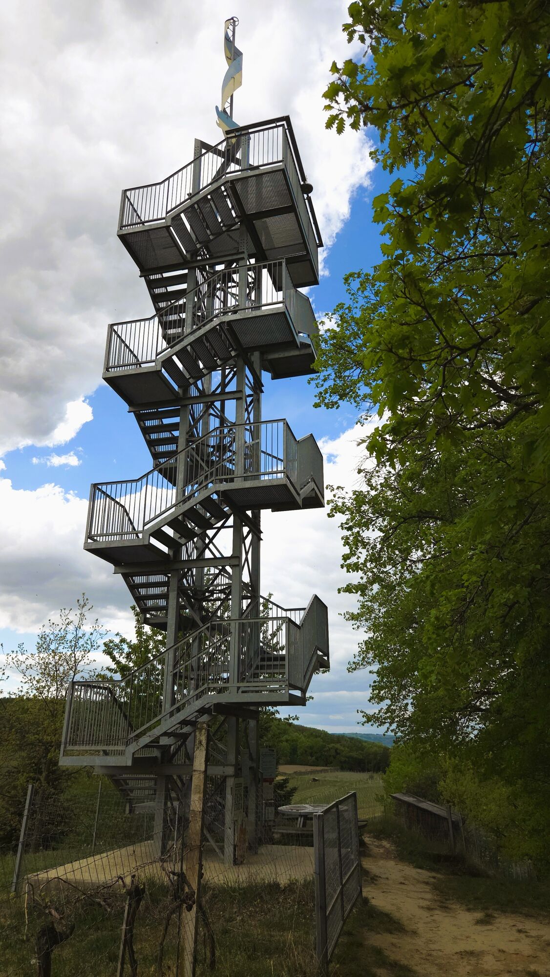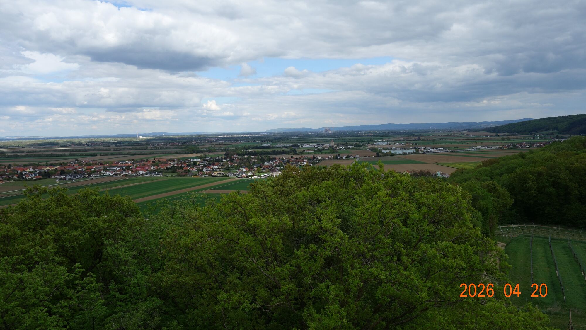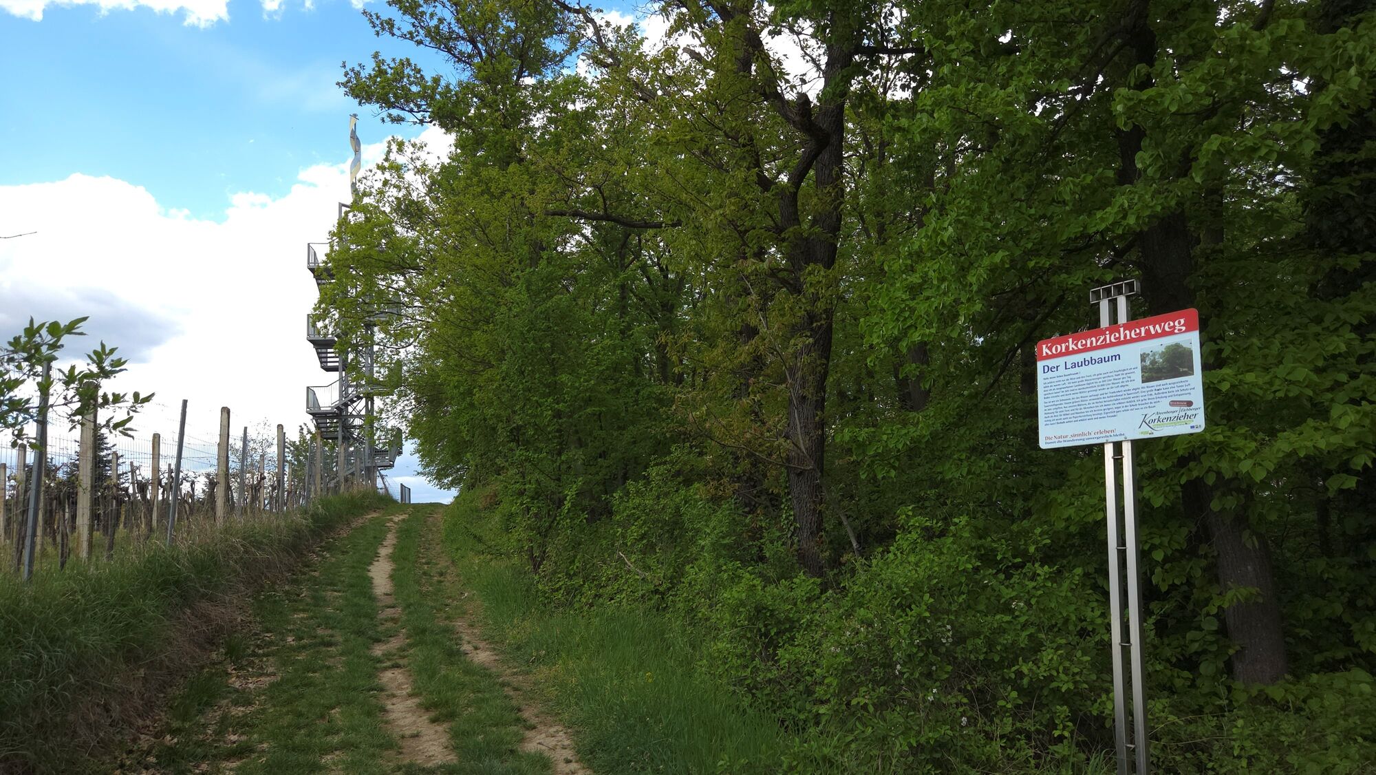 Beginn des Spazierganges ist in Ahrenberg östl. der gleichnamigen bekannten Kellergasse. Ausgehend vom Parkplatz bei der Kapelle, erst auf der Ahrenberger Ortsstraße, dann rechts in die Kellergasse an der Weinpresse vorbei. In die Kellergasse und gleich nach der Kurve vor dem gelben Haus rechts über die kleine Wiese am Waldsteig und hoch. Im Wald am Steig auf den Rücken des Eichberges und runter in den Sattel, jetzt offen und hoch zur Aussichtswarte am 265m hohen Fuchsberg mit der Aussichtswarte Korkenzieher (Plattformhöhe 12m).