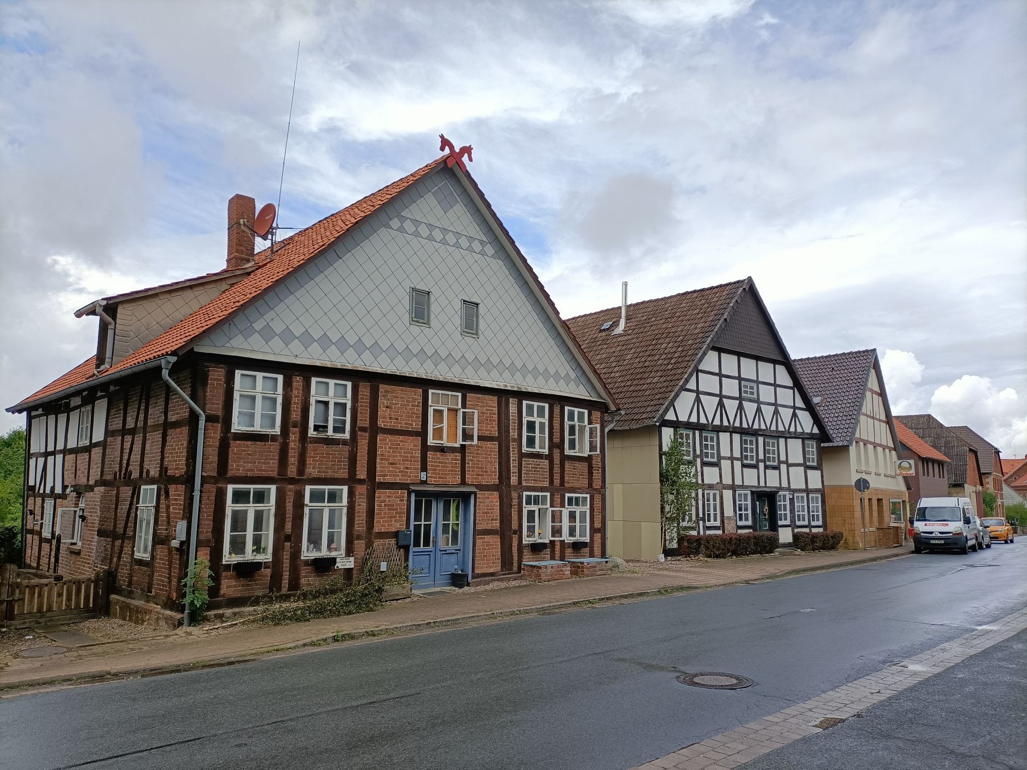 From Behrensen, head south through the fields with a detour to the district of Diedersen. Now cycle through Diedersen on the bike path further south towards Bisperode. At the crossing of state road L 588 you can complete the small loop with a visit to Bessingen. For this, turn left. Or follow the signs to the right further to Bisperode. From the town center, the route leads west uphill, past the gliding airfield into the town of Voremberg, where you turn left and continue on the road to Völkerhausen. There you meet the BauernLand Weser bike route. Together the routes lead up a steep hill (possibly dismount and push) into a shady forest and then, after enjoying a splendid view, arrive in the town of Börry.