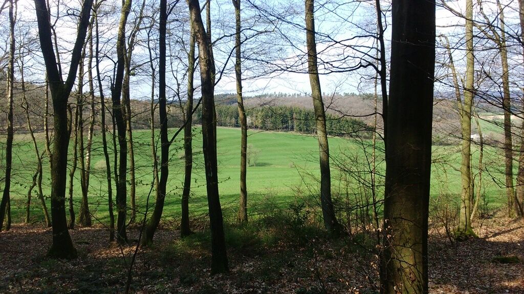 Wir wandern weiter geradeaus in den Wald und gelangen zur Schutzhütte des SGV Abt. Affeln. Weiter geht es bergab bis zur Wiese, in der der Borkebach entspringt. Wir biegen rechts ab, links die Wiese mit dem Borkebach. Wir nehmen rechts den schmalen Pfad und gelangen so zum Wanderparkplatz zurück.