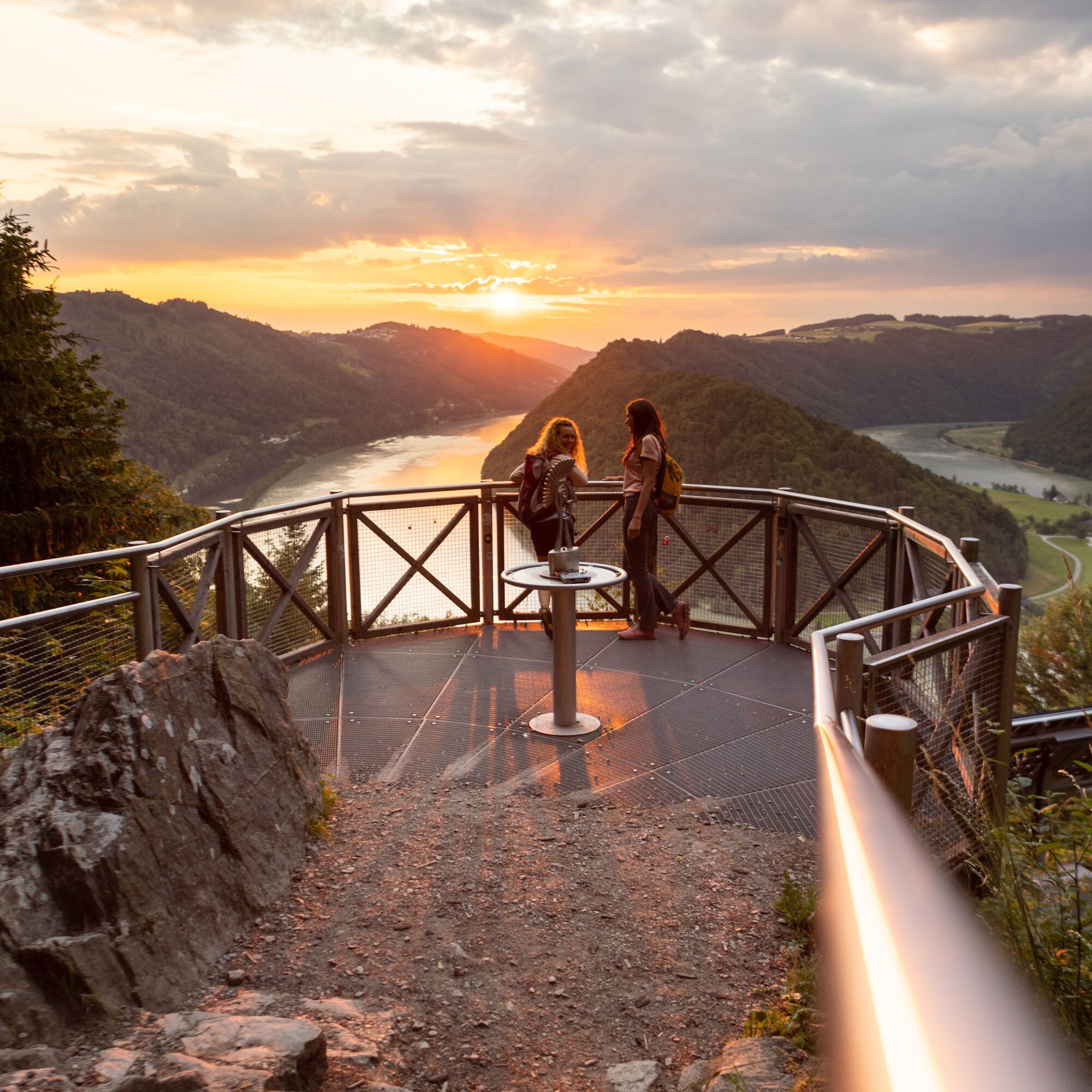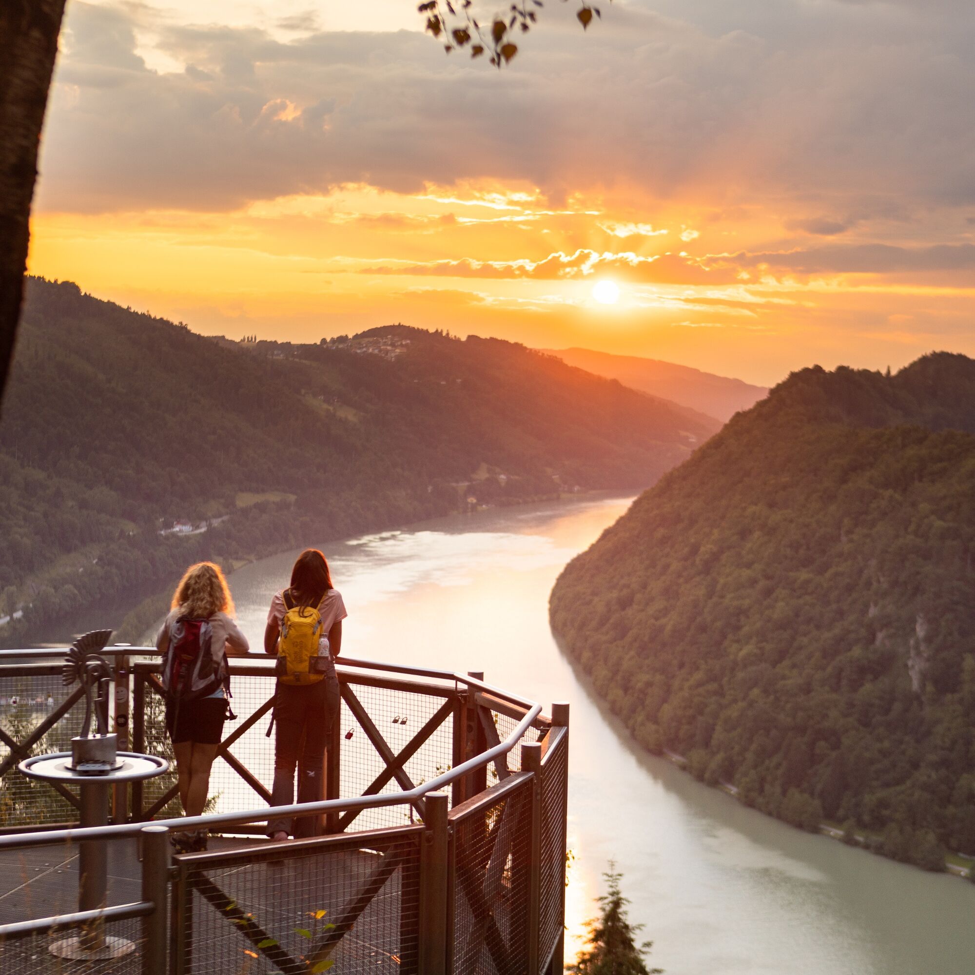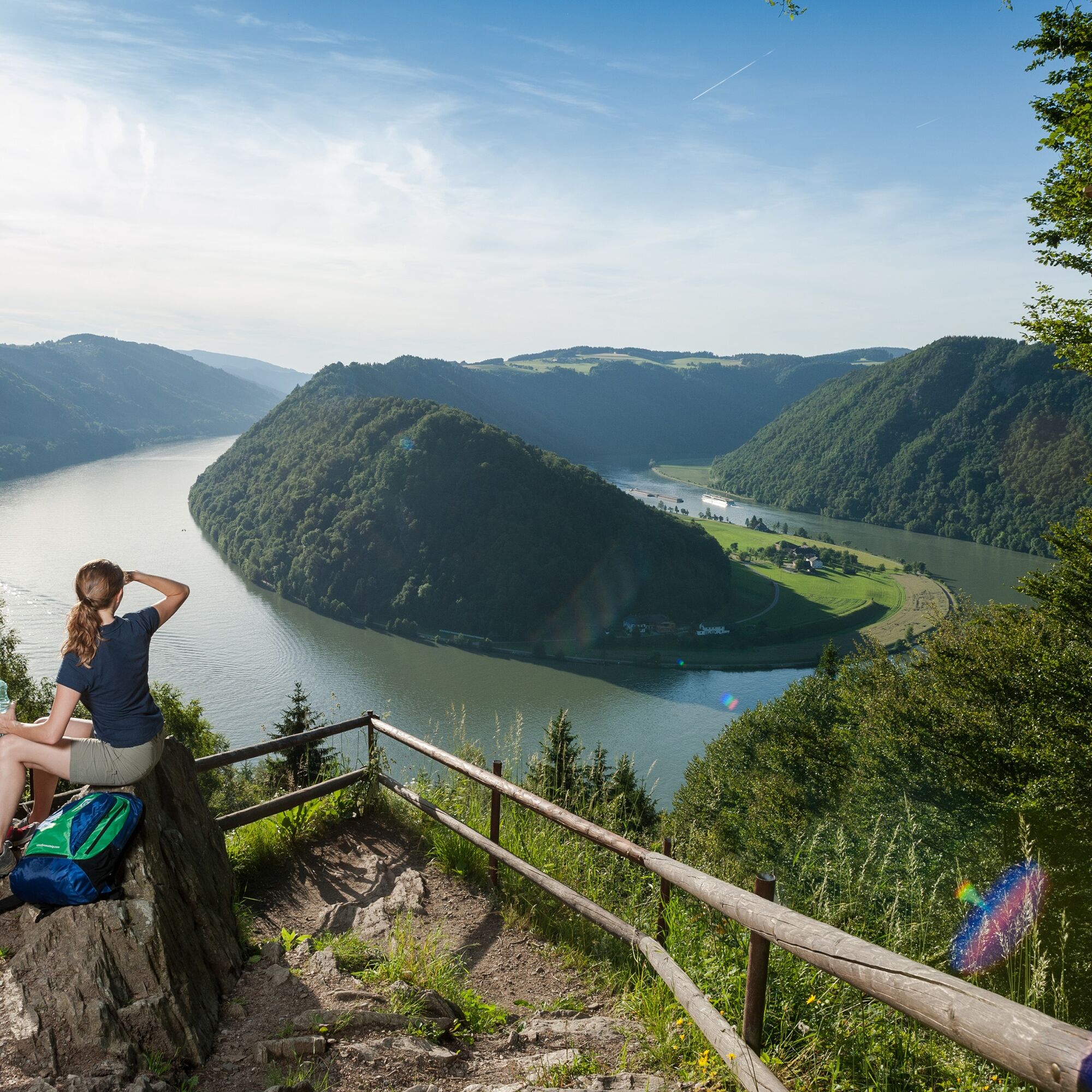 This Donausteig stage starts in Engelhartszell. The historic Danube market is nestled in the forest-rich breakthrough valley of the upper Danube close to the Bavarian border. The beautiful town center tells of a significant history as an imperial toll station and blends with the settings of the Engelhartszell Danube world into an experience world "Danube" – simply amazing! From the village center, we follow the mighty Danube River along the towpath about 4 km downstream. At the start, a short detour to the Trappist Abbey Engelszell and its wonderful Rococo church – a true jewel – is recommended! Later, the long Danube bank offers plenty of time for reflection. Suddenly, the conscious silence of the Trappist monks gains new quality and sharpens our senses for the special things along the way. In Oberranna, we make a short curve up into the mixed forests of the steep Danube slopes. The beautiful view back into the Danube valley rewards our effort. At the mouth of the Kleine Kösslbach into the Danube, we return to the large river. Now the ascent begins through the secluded Kleine Kösslbach valley – one of the top 10 natural highlights of the Donausteig! After a stretch of forest road, a magnificent hiking trail leads uphill through primeval gorge forests. Moss-covered block piles and mystical rock towers inspire our imagination. The highlight of this natural jewel is the rock balcony "Felsen-Blick" high above the valley – a secluded power spot! Shortly after, the rural Sauwald plateau begins. A atmospheric mosaic of extensive forests, flower-rich meadows, fertile fields, and traditional homesteads shapes this rolling cultural landscape. Over small country roads, we climb up to the Donausteig rest area "4/4-Blick". Congratulations – here we stand on the first summit of this stage! The unique 360° panoramic view allows seemingly endless vistas in all four quarters of Upper Austria. Then we continue on scenic country roads, through gentle ups and downs of the wonderful cultural landscape. In Aichberg, the Donausteig leads down into the dense forests of the steep Danube slopes and follows there, high above the Danube, the mighty river. The diversity of the forests here in the upper Danube valley becomes evident. In Waldkirchen, we return to the plateau. Here, a short detour to the village's picturesque parish church is recommended. The Donausteig now makes a deep loop down into the forest-rich Danube slopes, offering beautiful views of the nearby Danube castles from Vornwald. Once back on the plateau, we enjoy the extensive cultural landscape and hike along rural side roads to Paschinger Hill with its Donausteig rest area. Congratulations – here we stand on the second summit of this stage! The magnificent panoramic view over three sides reveals an incredible 20 church towers. Now the descent begins. Small village roads lead us to Straß, from where we descend via field and forest paths through the steep Danube slopes to the grand natural wonder of the Schlögen Danube loop. Donausteig – simply an experience!