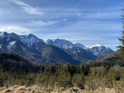 Oben angekommen bietet sich beim Strommasten ein kleiner Ausblick Richtung der südlichen Berge. Auf dem Forststraßen bietet sich übrigens auch immer wieder der schöne Ausblick Richtung dem gegenüberliegenden Feuerkogel.