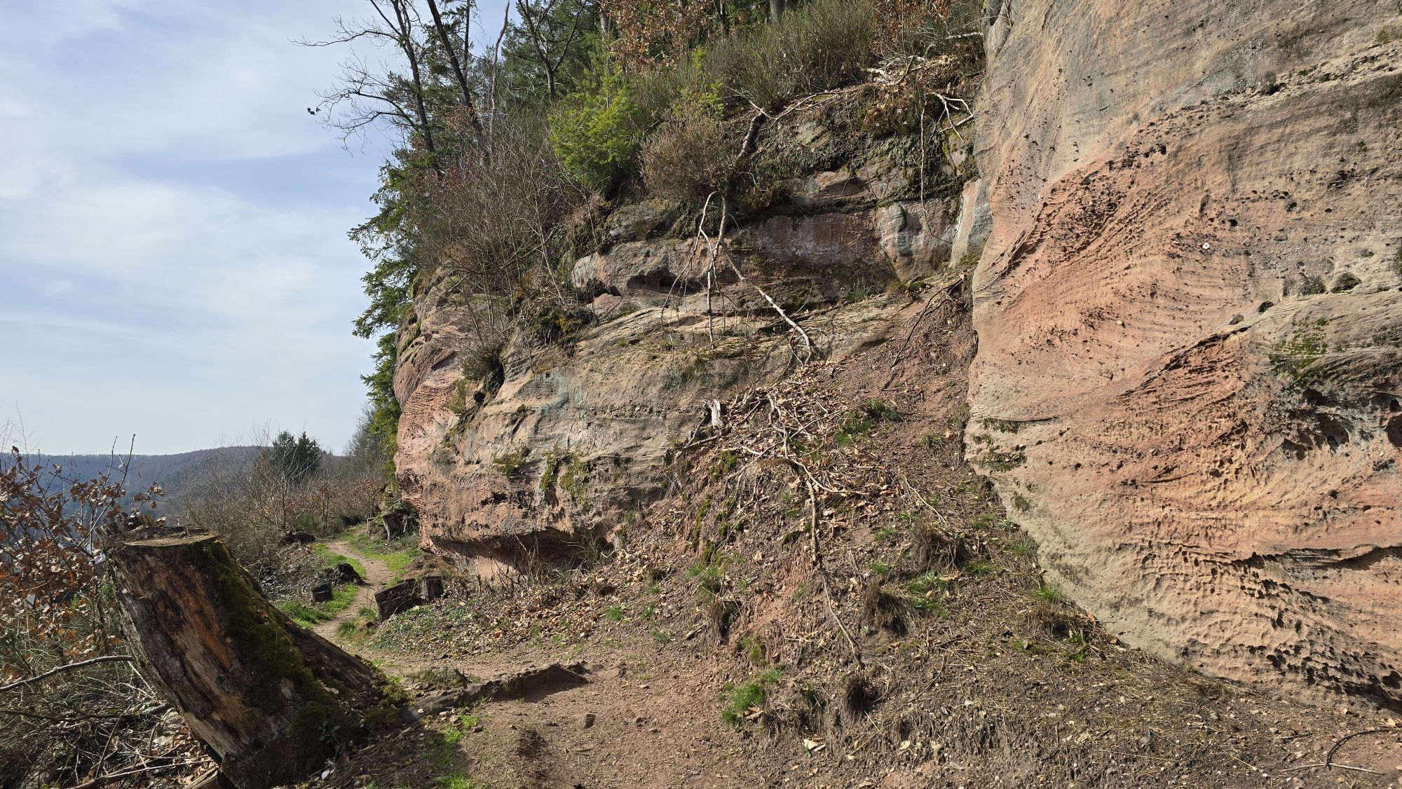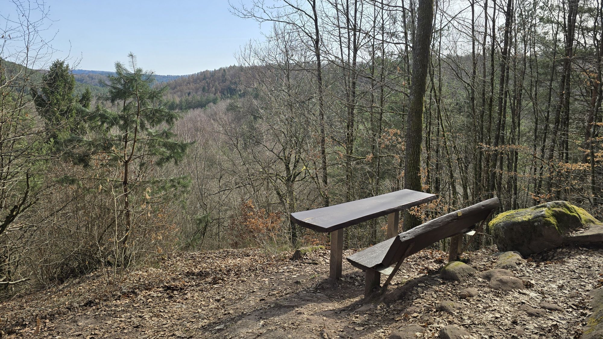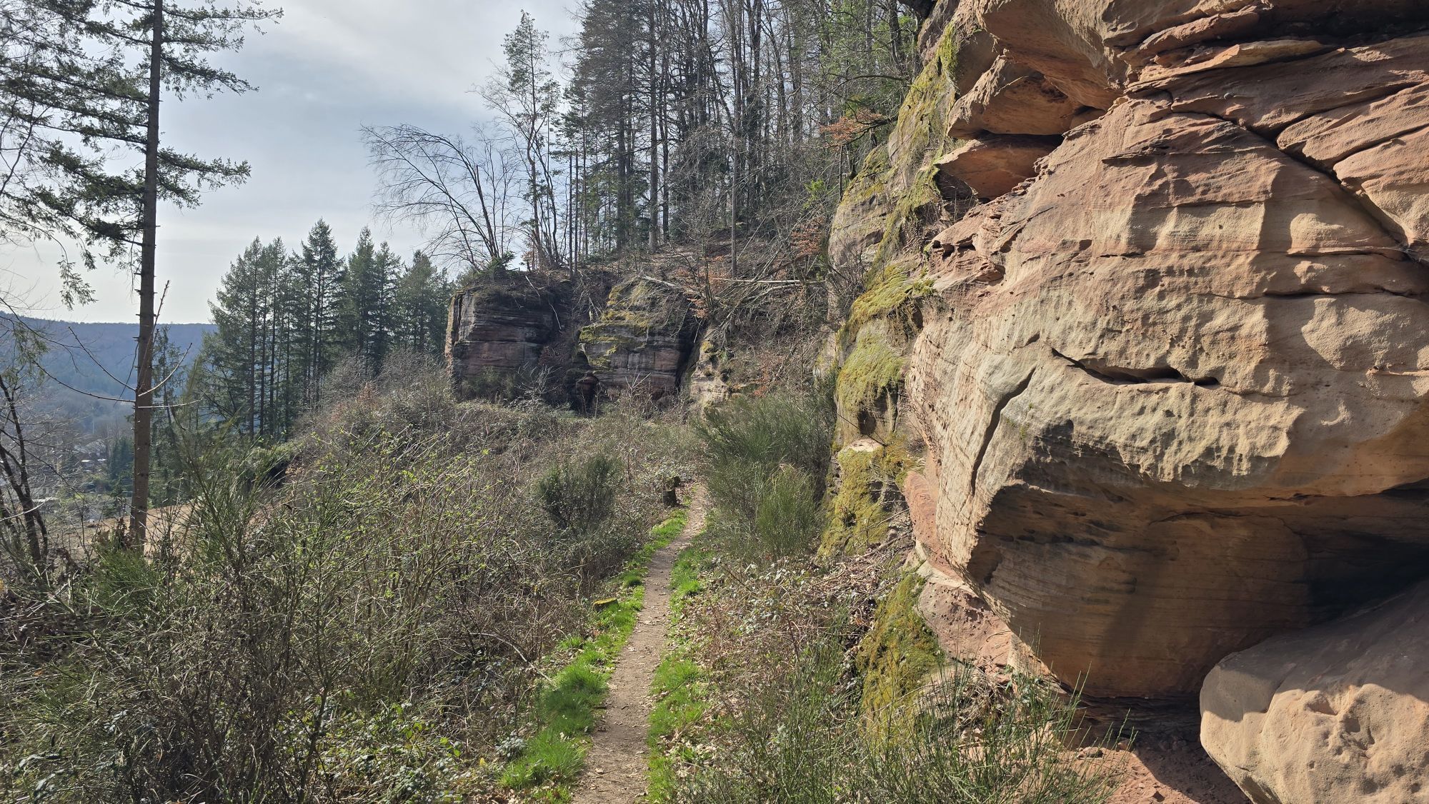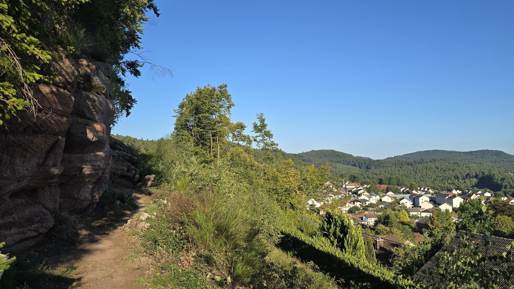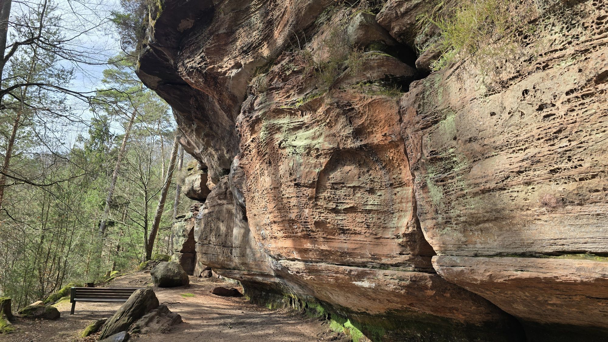 From now on, you will pass impressive Buntsandstein rock formations almost every minute. First, you see the rear and front Rappenkopf, whose names probably derive from their impressive form. At the Rappenteich rock, under whose rock overhang there is another cozy seating area, you can pause again and take a break. The next highlight is the mighty rock walls of the Saufelsen, before you can catch almost continuous beautiful views of the charming town of Rodalben on the lengthy Hilschberg rocks. Finally, shortly before returning to the starting point, you also pass the Krappen rock.