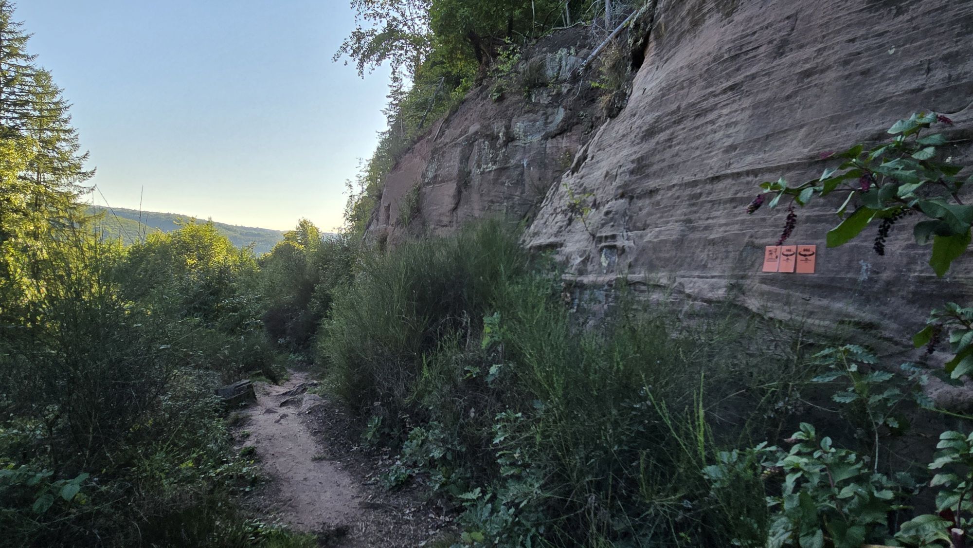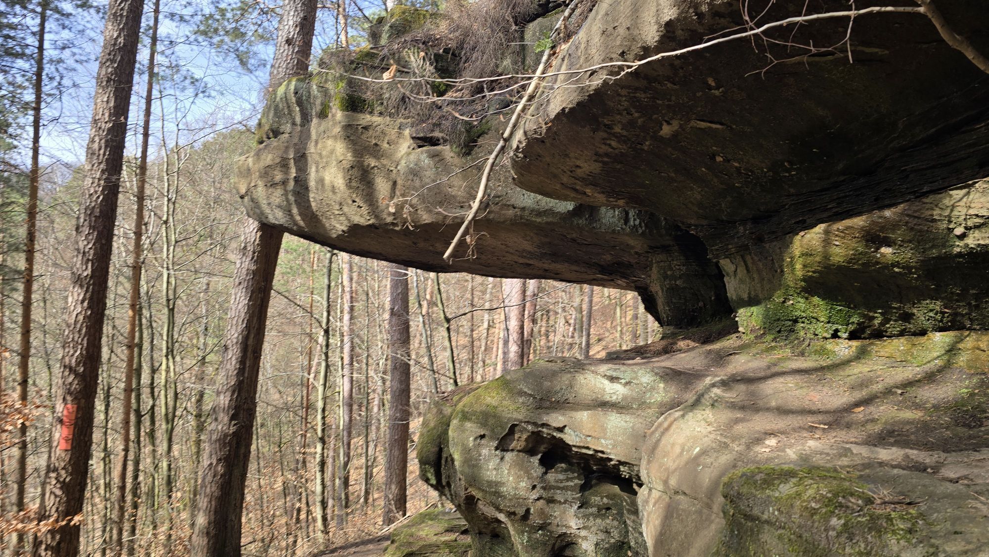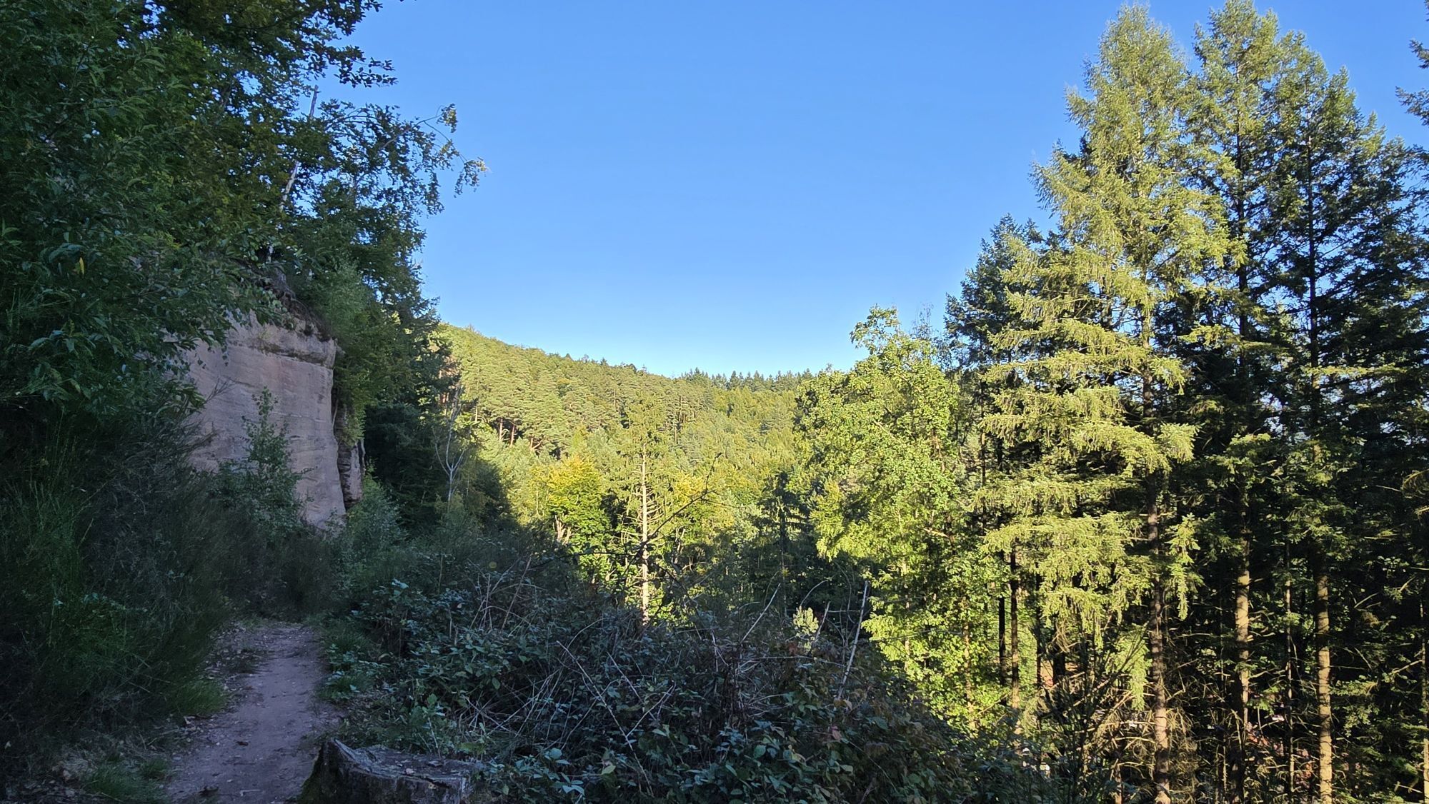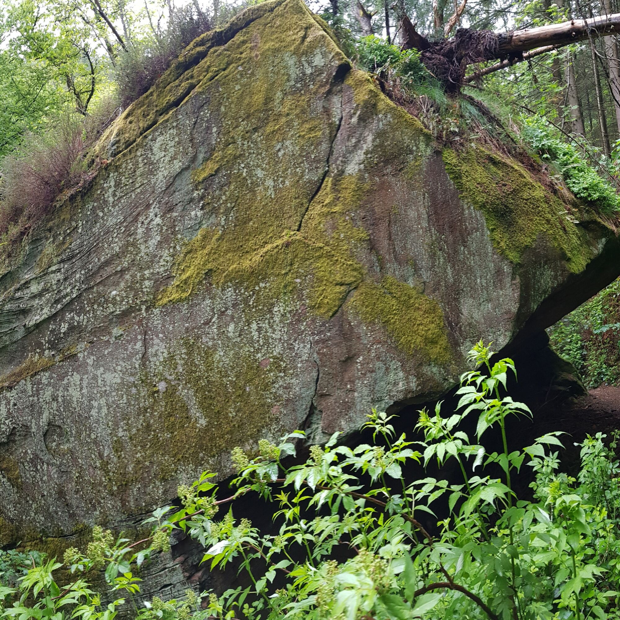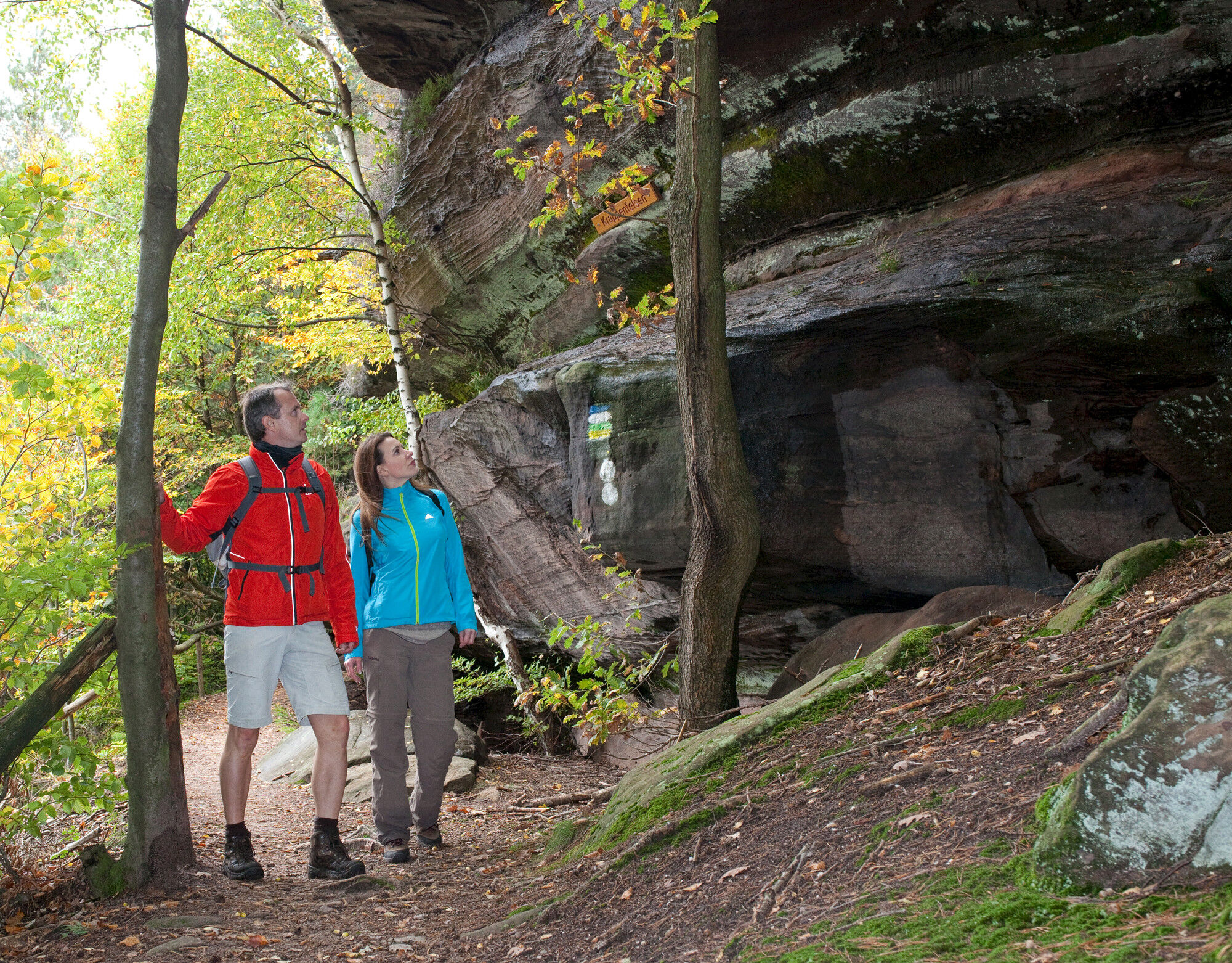 From now on, you will pass impressive Buntsandstein rock formations almost every minute. First, you see the rear and front Rappenkopf, whose names probably derive from their impressive form. At the Rappenteich rock, under whose rock overhang there is another cozy seating area, you can pause again and take a break. The next highlight is the mighty rock walls of the Saufelsen, before you can catch almost continuous beautiful views of the charming town of Rodalben on the lengthy Hilschberg rocks. Finally, shortly before returning to the starting point, you also pass the Krappen rock.