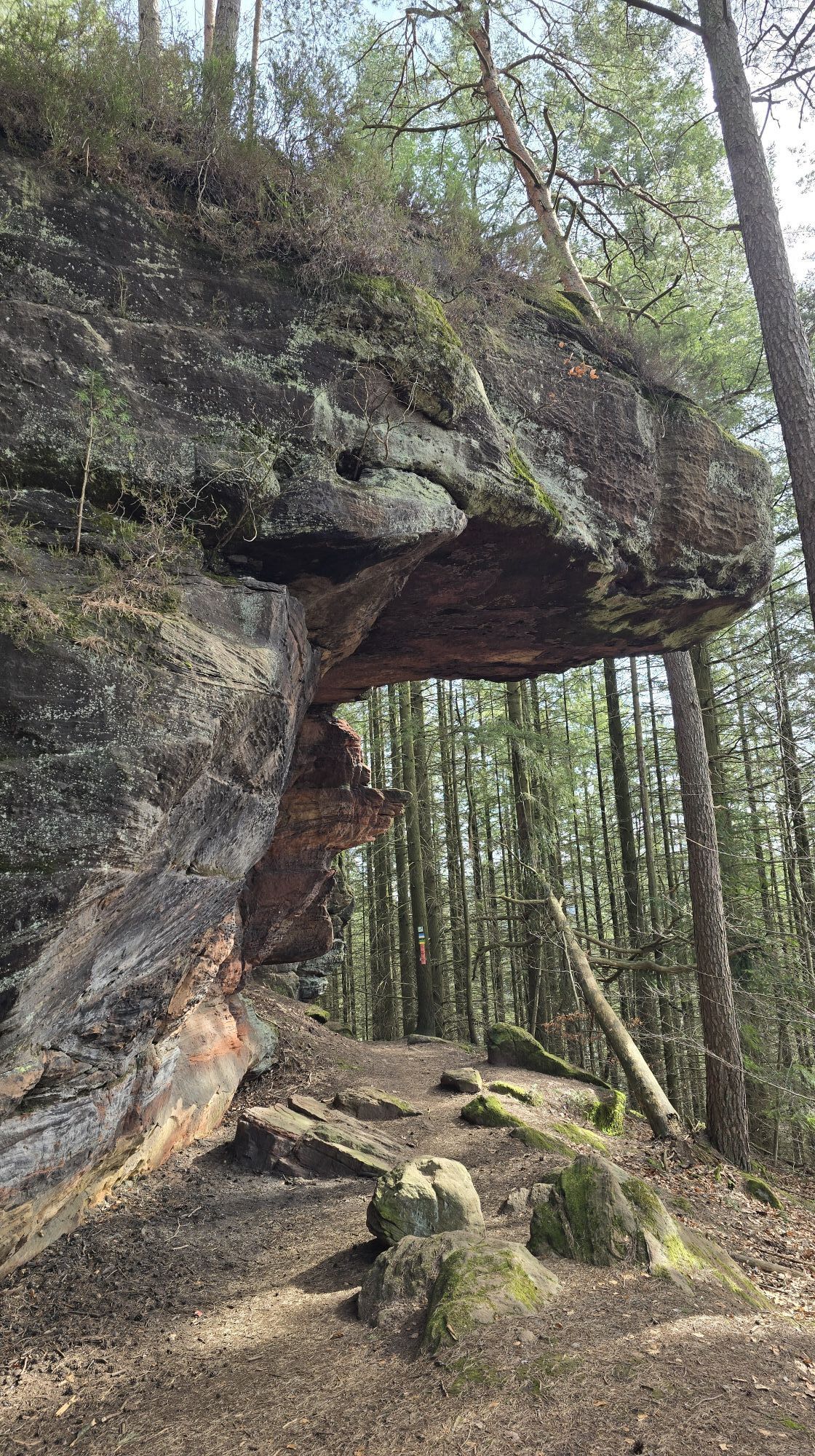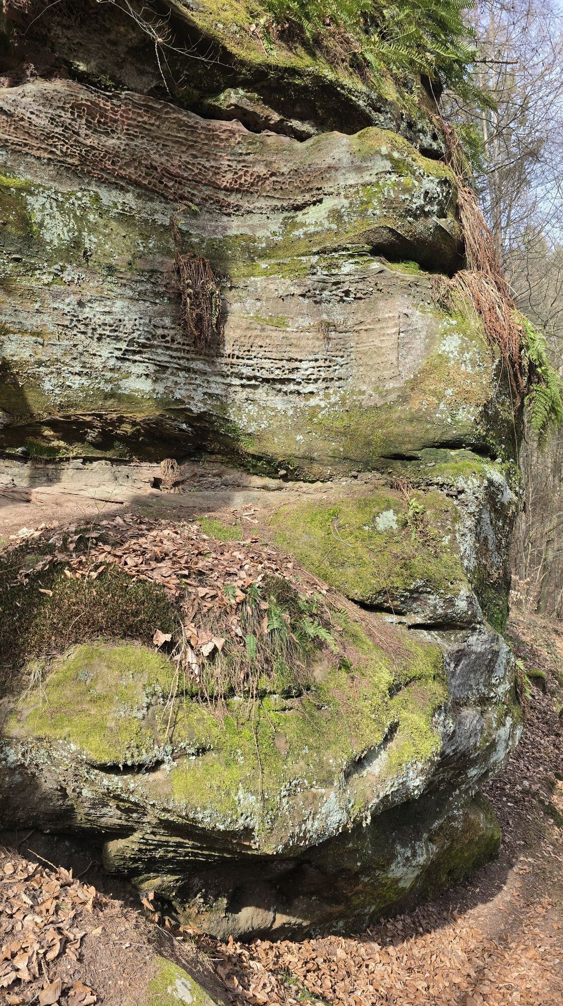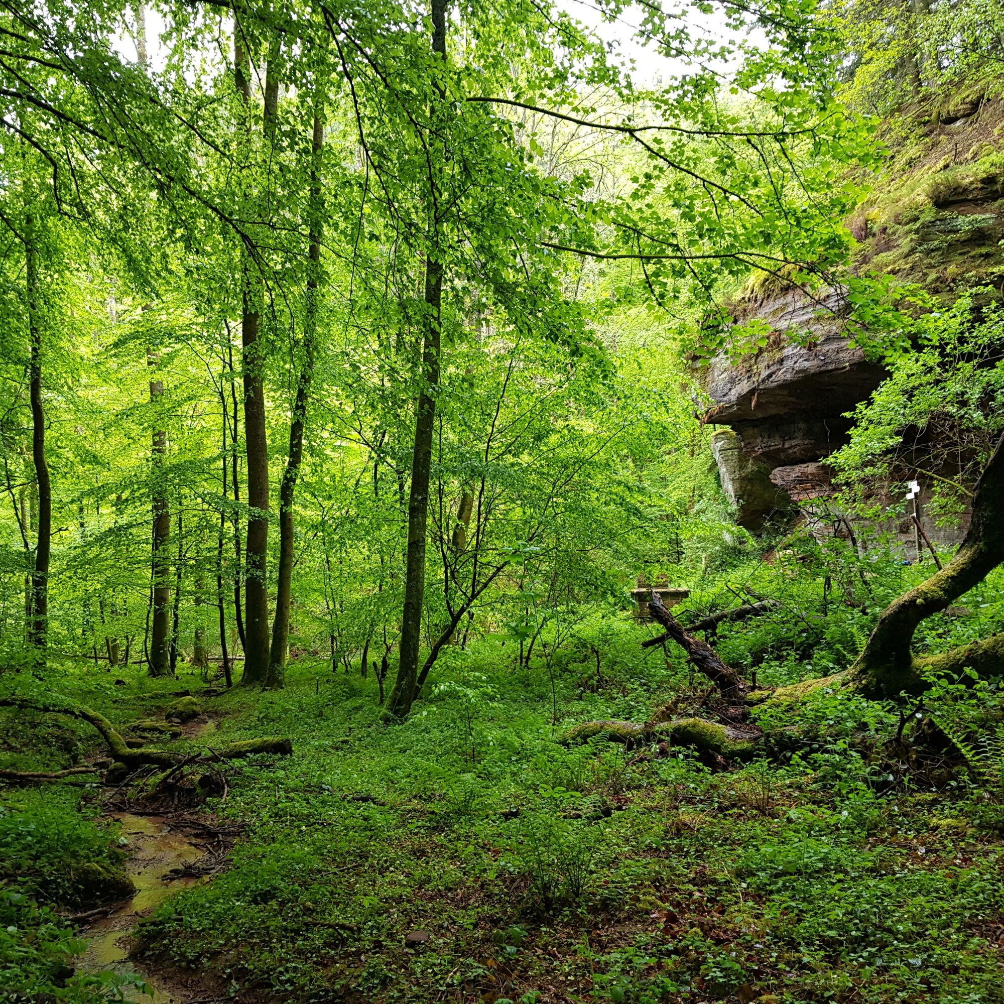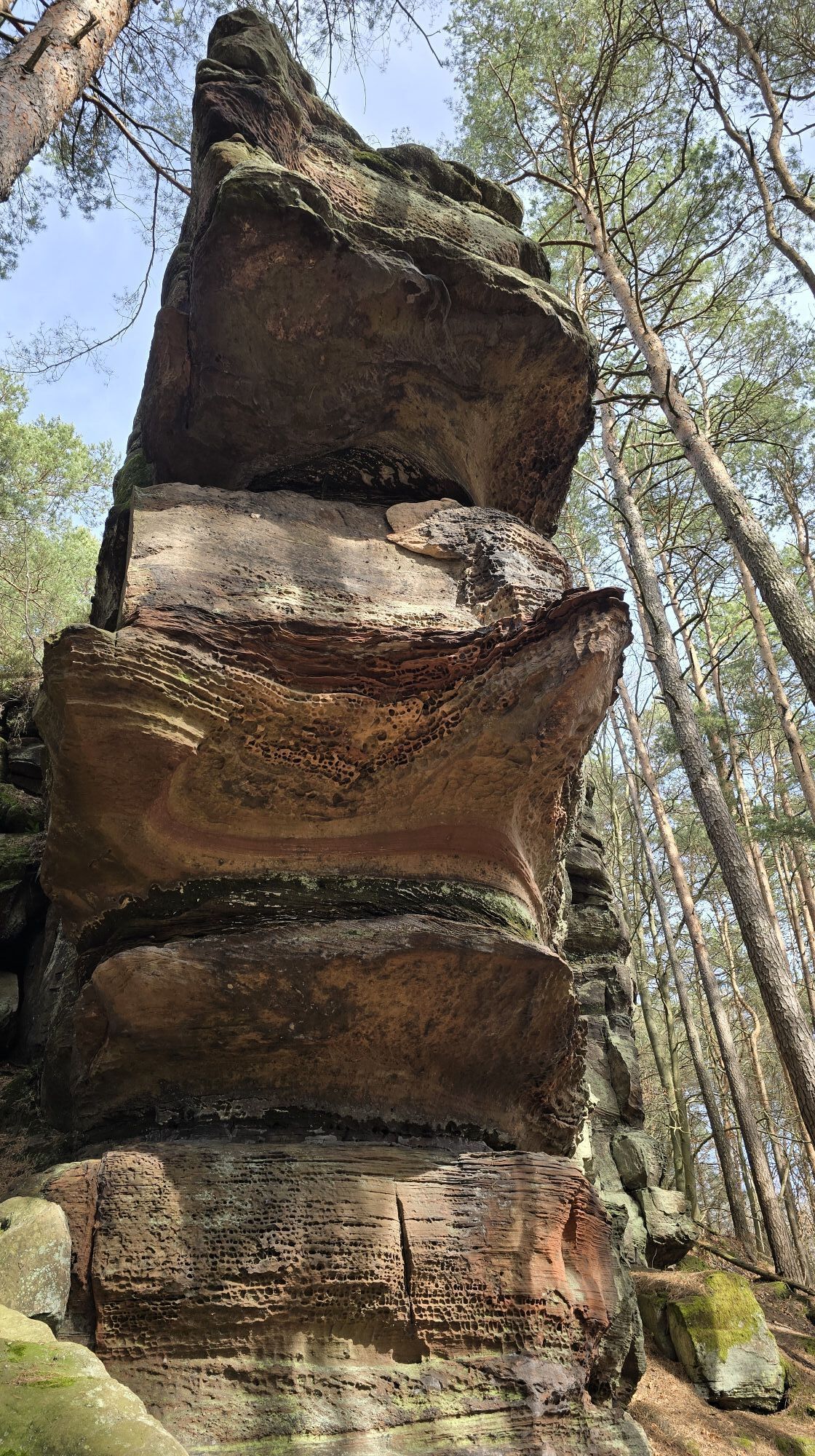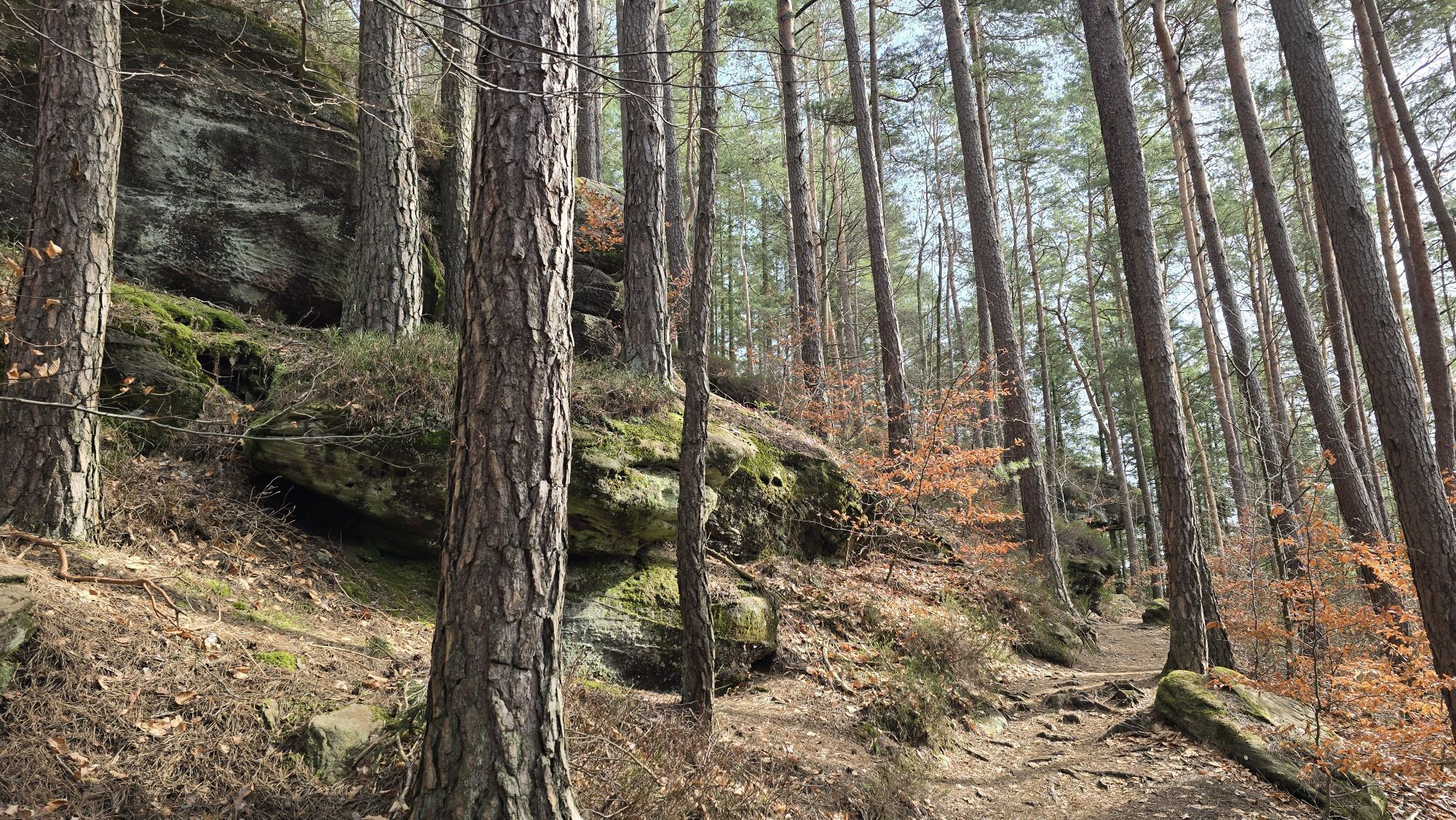 From now on, you will pass impressive Buntsandstein rock formations almost every minute. First, you see the rear and front Rappenkopf, whose names probably derive from their impressive form. At the Rappenteich rock, under whose rock overhang there is another cozy seating area, you can pause again and take a break. The next highlight is the mighty rock walls of the Saufelsen, before you can catch almost continuous beautiful views of the charming town of Rodalben on the lengthy Hilschberg rocks. Finally, shortly before returning to the starting point, you also pass the Krappen rock.