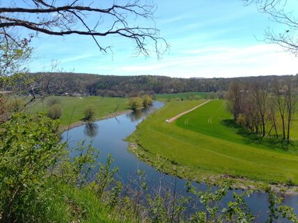 Starting at the Fischendorf hiking car park, a detour first leads over the footbridge to the large red porphyry wall below Mildenstein Castle. Those arriving by train take the route over the Mulde bridge or the part of Bergstraße running through the valley to the red wall and continue over the footbridge to the hiking car park. From there, the local hiking trail R3 leads over Waldstraße and behind an old factory site to the Riedelsteig on the northern bank of the Freiberger Mulde to Klosterbuch. Here, a visit to the former Cistercian monastery Buch is recommended. After crossing the Mulde bridge, we leave the signposted route and reach the viewpoints Wettinstein and Maylust via the Klostersteig. From there, we follow the Muldental hiking trail Freiberger Mulde (Tannenbergweg) to the fork in the road at Wendishain, keep right and follow the road (K 7540) uphill. Alternatively, immediately opposite the fork, we turn onto the unmarked forest path. At the Paudritzsch nursing home, the path meets the local hiking trail R3 (Muldental hiking trail, K 7540) again. From there, we continue our route to Eichberg. On the Eichgrundweg, developed as a 'nature trail', it leads back to Leisnig. After a few hundred meters on G.-F.-Händel-Straße or on the parallel Bahnhofstraße running below (signposted cycle route) towards the center, we reach Leisnig station. The route back to the hiking car park leads over the Mulde bridge, past the rock plateau with the town and the castle Leisnig. For a detour there, we choose Schlossstraße uphill shortly before the bridge. Alternatively, we reach the red porphyry wall and the footbridge at the starting point via Bergstraße (in the valley next to the railway tracks).