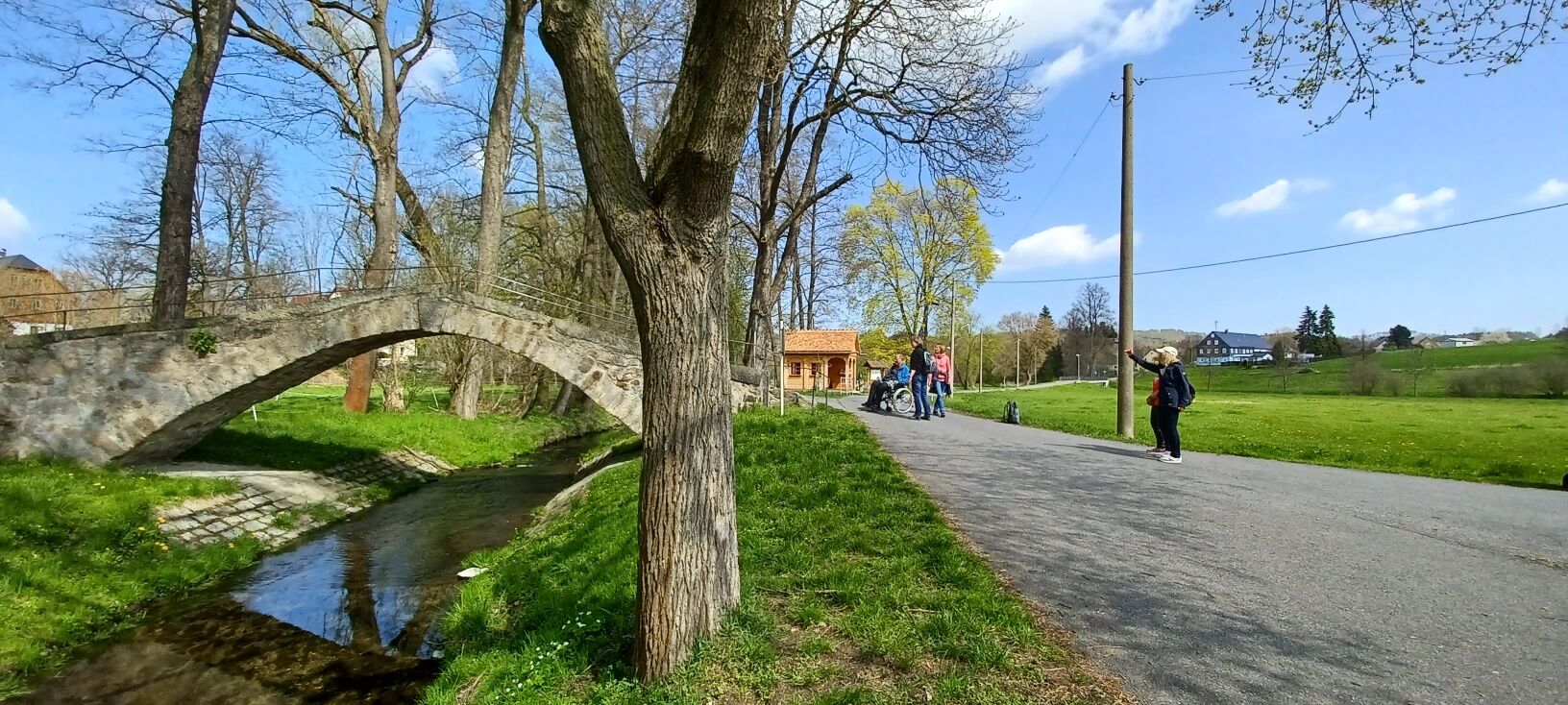 Zunächst wandern wir an der Spree entlang zur Himmelsbrücke. Die Himmelsbrücke wurde im Jahr 1796 zunächst als hölzerne Brücke erbaut und diente der Überquerung der Spree als sicherer Zuweg zur Kirche. Später wurde der hölzerne Bau durch die granitsteinerne Bogenbrücke ersetzt. Diese bekam wegen ihrer steil aufsteigenden Formden Namen Himmelsbrücke und wurde in neuerer Zeit zum Wahrzeichen von Sohland erklärt.