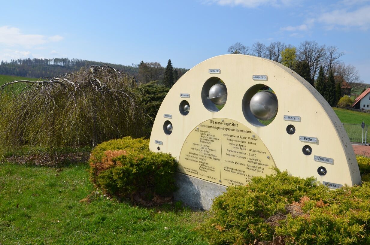 Unsere Tour startet am „Ferienhof Sohland“. Von hier aus fahren wir mit dem Auto zum Gelände der Sternwarte Sohland undschauen uns das Modell des Sonnensystems sowie die Schautafeln und Modelle zur Astroarchäologie an.