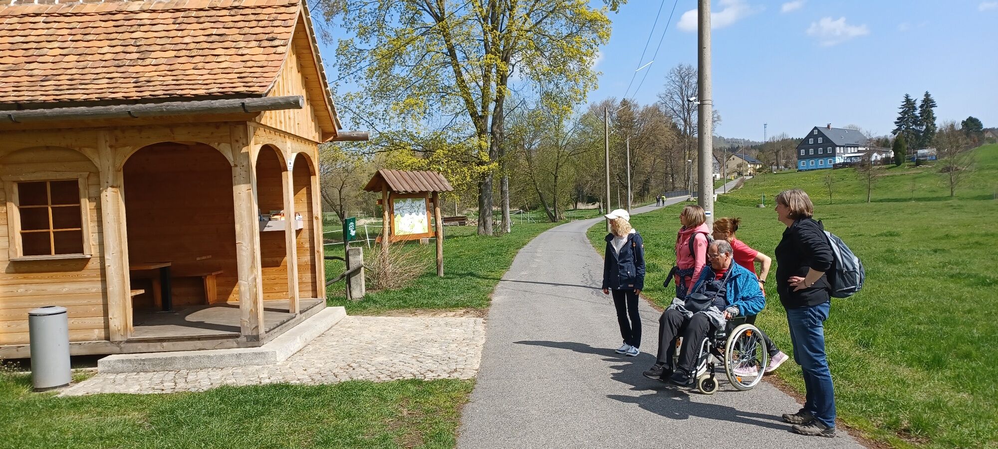 Von Cunewalde fahren wir zurück nach Sohland und kehren bei der Bäckerei Fehrmann im Edeka-Markt zum Mittagsimbiss ein. Eine behindertengerechte Toilette ist vorhanden. Dann fahren wir mit dem Auto zum Stausee und parken am öffentlichen Parkplatz. Hier gibt es einen behindertengerechten Parkplatz.