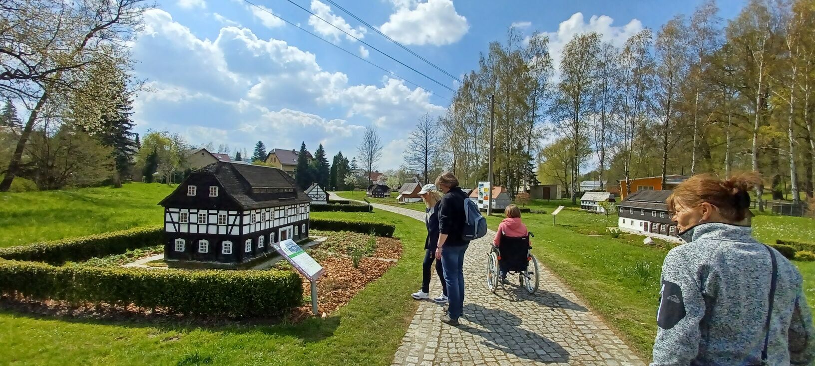 Von der Sternwarte aus fahren wir anschließend weiter nach Cunewalde und besuchen den Umgebindehauspark. Hier erwartet den Besucher eine Miniaturwelt von Umgebindehäusern. In dem liebevoll gepflegten Park können 16 unterschiedliche Modelle des einheimischen Baustils im Maßstab 1:5 bestaunt werden.Der Park ist frei zugänglich und es wird kein Eintritt erhoben. Cunewalde ist ein sehr schöner und gepflegter Ort. Es ist mit 11 km das längste Straßendorf Deutschlands und man findet hier auch Deutschlands größte evangelische Dorfkirche mit 2.632 Sitzplätzen.