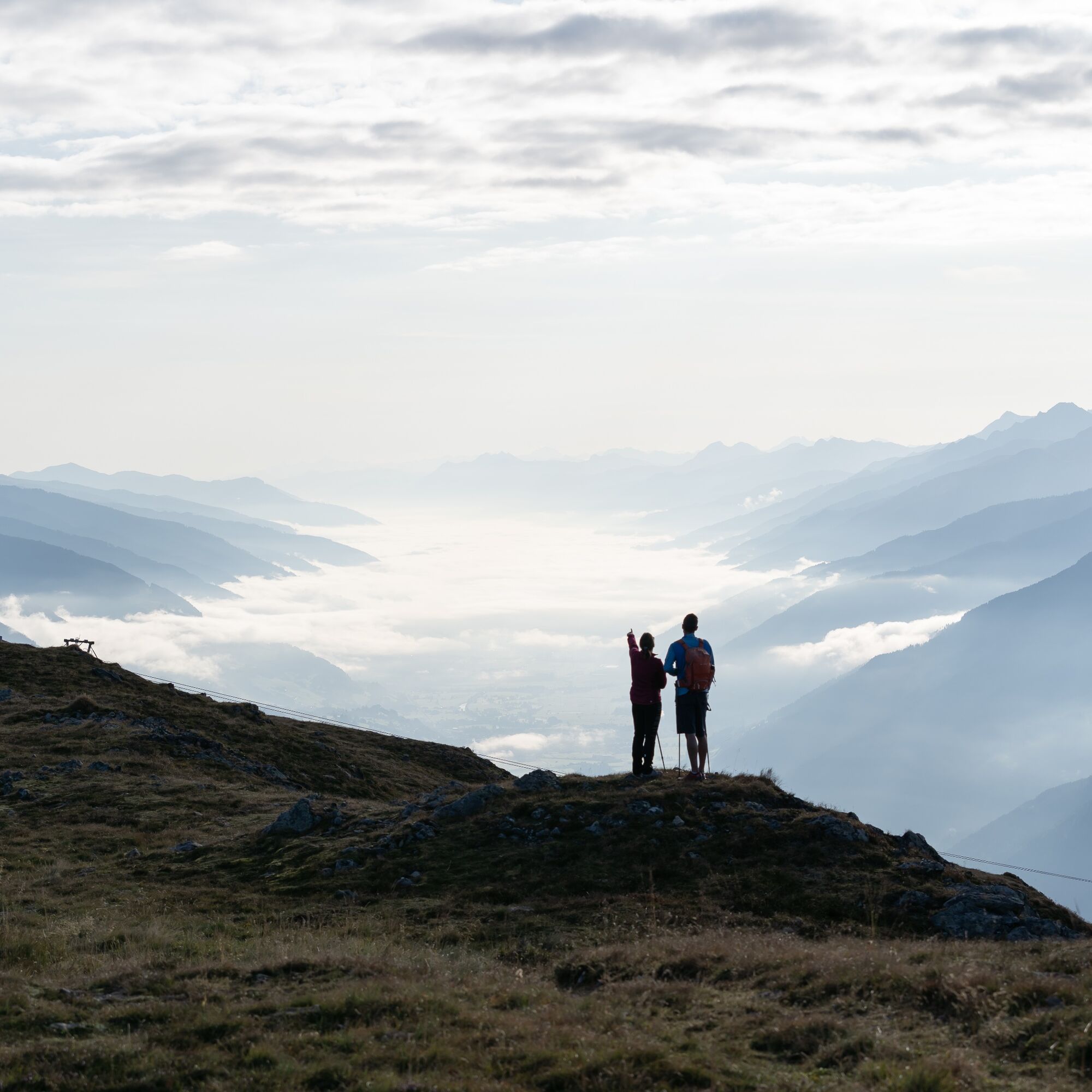 Nun hältst du dich auf den rechten Wanderweg Richtung „Frühmesser“, umgehst einen kleinen Felsaufschwung rechts über einen neuen Wanderweg und steigst immer am Kamm bzw. knapp rechts davon bis zum Gipfel des Frühmesser (2.233 m) mit seinem großen Gipfelkreuz. Überschreite den Gipfel und steige über den Kamm hinab in eine Scharte zwischen Frühmesser und Braunkogel, wo du einen Fahrweg erreichst. Über diesen könntest du den Braunkogel links (östlich) umgehen – unsere Route führt uns jedoch auf schmalem schönem Steig rechts um den Braunkogel herum. Dafür gehst du in der Scharte durch ein Gattertor und steigst nicht auf den Braunkogel hinauf, sondern umrundest ihn rechts auf schmalem Steig. Steige zum Schluss den Kamm, der vom Braunkogel nach Süden zieht, hinab und somit erreichst du bei einem Skilift wieder den Fahrweg. Nun den Fahrweg zunächst abwärts zum Gasthaus Wolkenstein und von dort wieder etwas ansteigend zur Bergstation der Wildkogelbahn, deinem Etappenziel. Nach dieser Etappe übernachtest du im Tal in Neukirchen bzw. in Bramberg.
