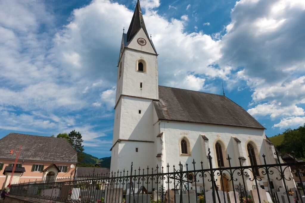 Die nächste Station ist die romanische Pfarrkirche St. Rupert, die zu den ältesten der Steiermark zählt. Vorbei an Feuerwehr und Musikheim überqueren wir die Brücke und pilgern vorbei an der Ortstafel von Kobenz bis wir nach ca. 10 Minuten die Tafel „Zur Murbrücke“ sehen. Wir halten uns links und gelangen zu diesem Verbindungssteg. Vor der Freizeitanlage Zechner halten wir uns scharf rechts und befinden uns auf einem Schotterweg, der uns durch ein Wäldchen direkt zur Murbrücke (Achtung: Wintersperre!) führt. Mitten auf der Brücke laden uns Bänke zum Verweilen ein. Links in Flussrichtung der Mur führt und der Weg weiter zum Reiterhof, vor dem wir rechts abzweigen, um die Kirche von St. Margarethen zu erreichen.