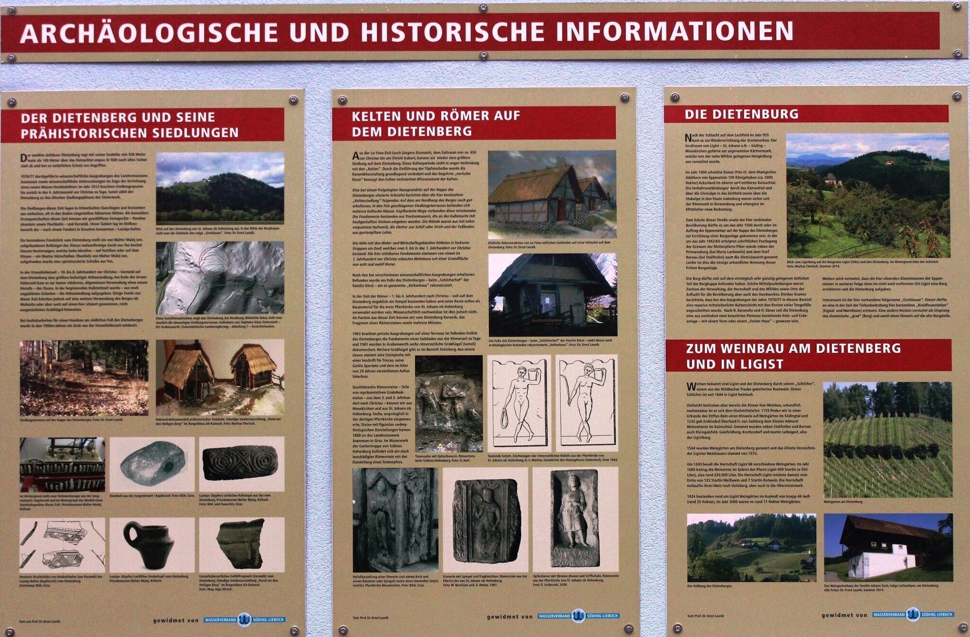 Nach kurzer ansteigender Wegstrecke stehen wir am Gipfel des Dietenberges mit seinen keltischen Ausgrabungen und einem prachtvollen Blick über den Ligister Talkessel. Der 1066 erstmals erwähnte Berg erhielt seinen Namen vermutlich vom seinem einstigen Burgherrn, einem Dieter.