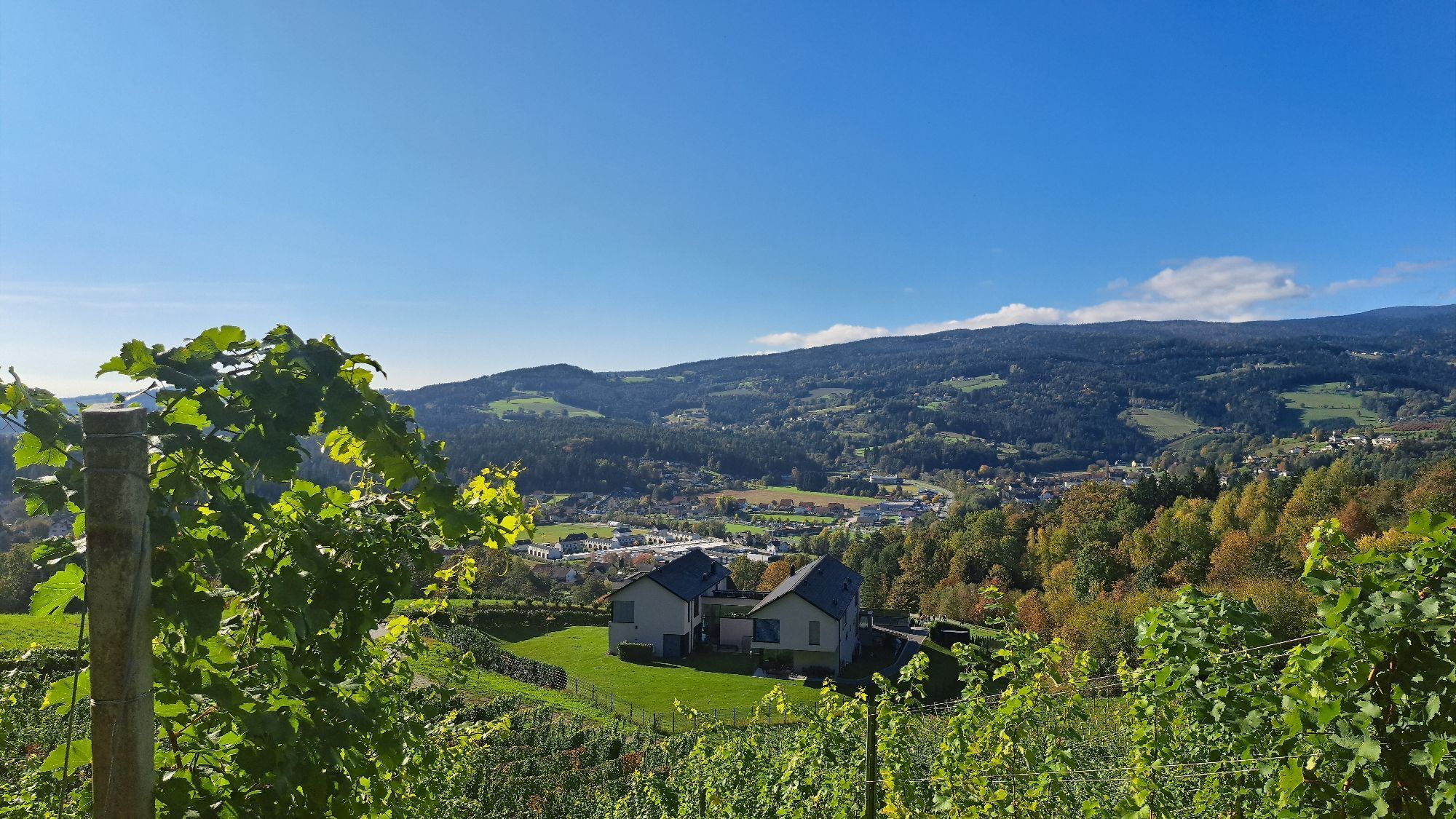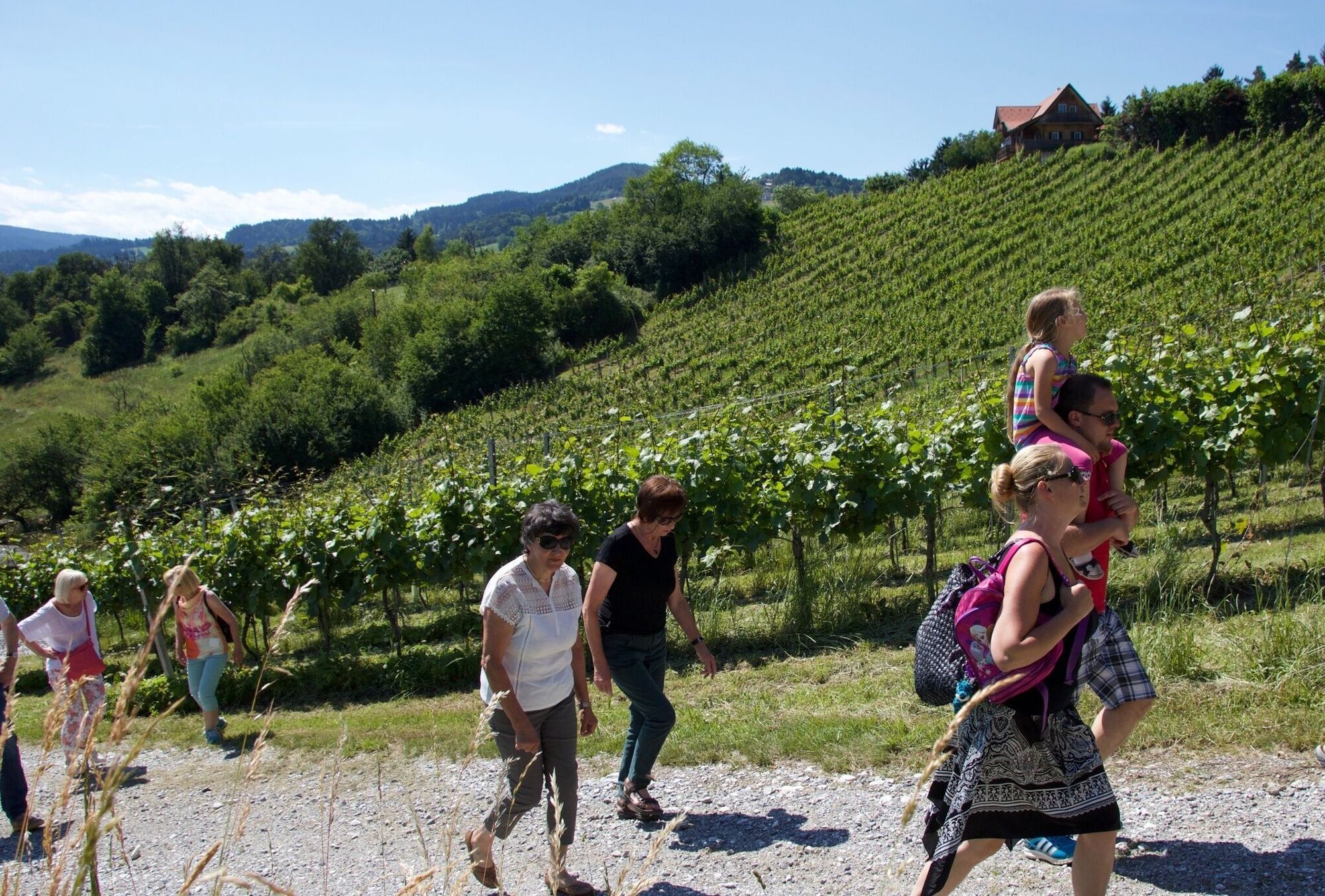 Erholsam gehen wir weiter durch einen verfallenen Bauernhof, bevor es wieder mäßig steil wird und wir die Region der Weingärten erreichen. Genussvoll ist die Wanderung durch die Weingärten mit sehr schönem Blick auf Ligist. Nach der Durchquerung der Weingärten führt uns der Weg wieder durch Wald, unterbrochen mit Tiefblicken zum „Teufelstein“ an der Ligister Umfahrungsstraße und auf den Ligistberg mit dem 805 m hohen Wartenstein.