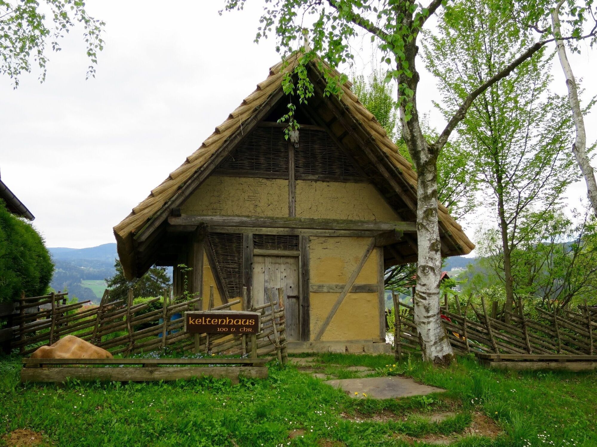 Abwärts gehen wir durch Weingärten, vorbei am Gasthaus Kürzl und einem in Originalbauweise nachgebildeten Keltenhaus, ca. 1 km der Straße entlang. Danach verlassen wir am Beginn des „Schwarzwaldes“ (ursprüngliche Bezeichnung für reinen Nadelwald) die Straße linksseitig, um auf einem Waldsteig bald zur Abzweigung des kürzeren Keltenweges nach Ligist zu kommen.