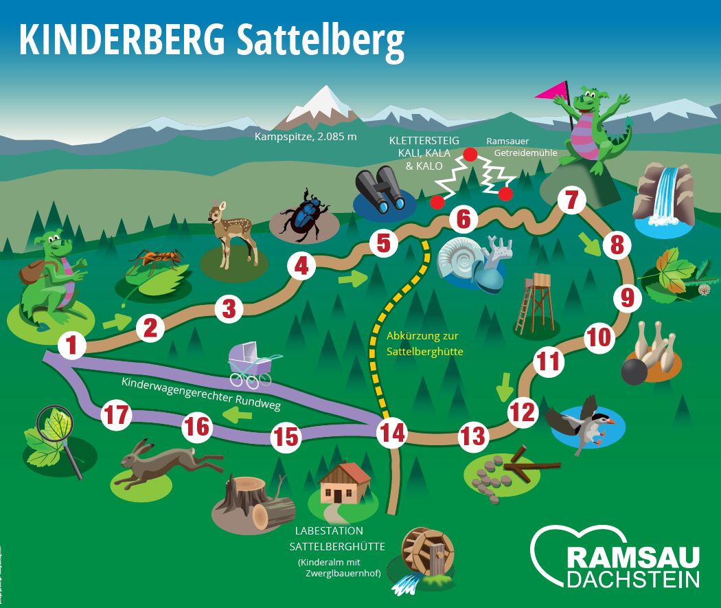 Der Sattelberg in Ramsau am Dachstein ist DER "Kinderberg" schlechthin. Der erste Österreichische Natur- und Umwelterlebnispfad ist aber nicht nur für die Kids spannend und interessant, auch Eltern und Großeltern werden dabei ins Staunen kommen. Er macht seinem Namen alle Ehre und hält noch mehr bereit: der Ramsaurier Zwergerl-Bauernhof (mit Schau- und Spieltafeln in Kleinkindergröße) ist Kalis Spielparadies für die Jüngsten. Es befindet sich direkt bei der Sattelberghütte. Ab dem Startpunkt ist ein Teil des Weges als kleiner Rundweg auch mit dem Kinderwagen zu befahren. Der Weg ist mit dem "Österreichischen Wandergütesiegel" ausgezeichnet!