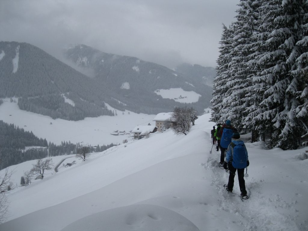 Wir sind eine kleine Gruppe begeisterter Natur- und Bergliebhaber, die die nächsten fünf Tage schneeschuhwandernd in Ost- und Südtirol verbringen. Die Wahl fällt heute auf den Dorfberg, ein 2115 m hoher Berg der Gailtaler Alpen. Wir starten am Kartitscher Sattel im osttiroler Gailtal und schrauben uns entlang eines kaum noch erkennbaren Forstweges bei tief winterlichen Verhältnissen hoch. Es schneit unentwegt; ein guter halber Meter kommt im Laufe des Tages auf die ohnehin schon ca. 2 Meter hohe Schneedecke noch dazu. Das Spuren im Schnee wird für jene die voran gehen, zur Schwerarbeit. Wir wechseln uns, so gut es geht, ab. Glücklicherweise erleichtern uns Skitourengeher ein wenig das Spuren.
