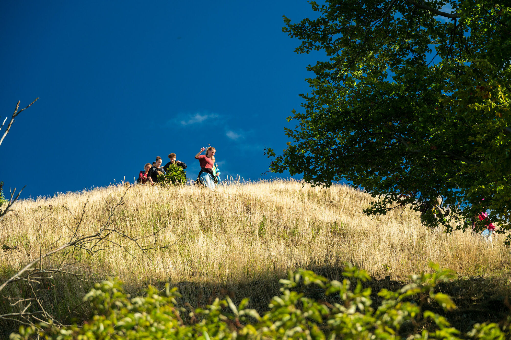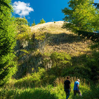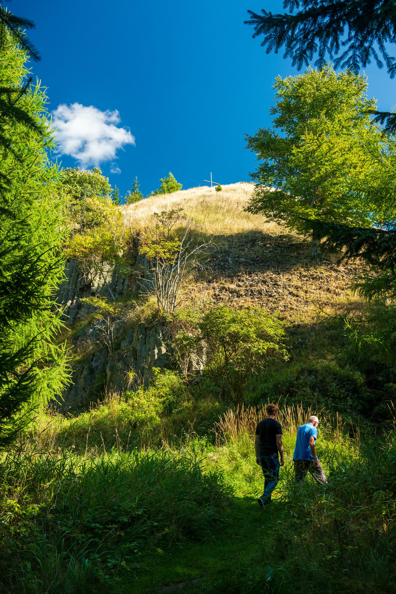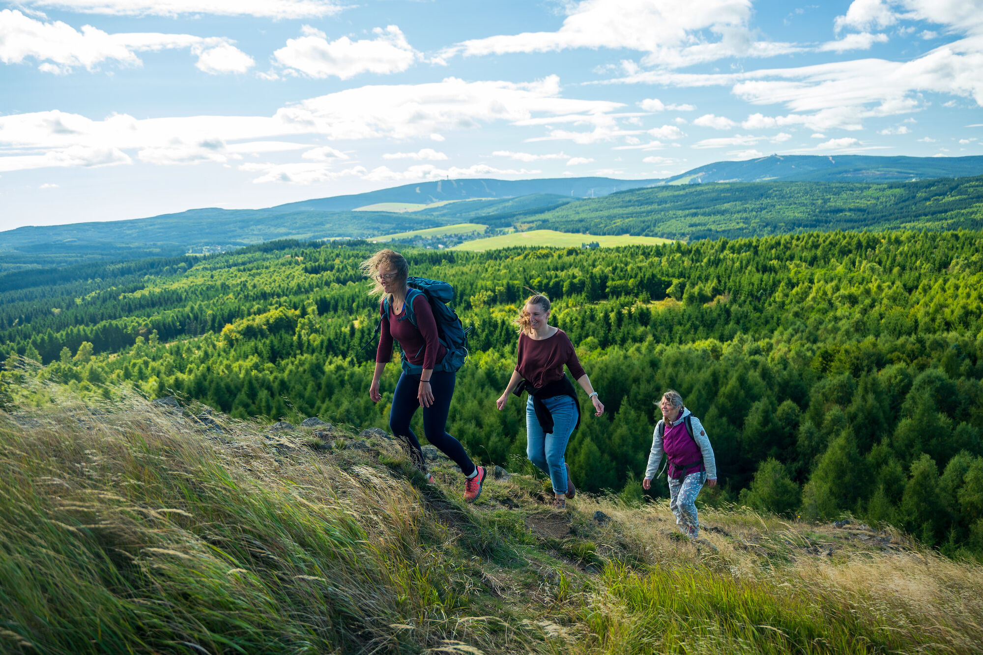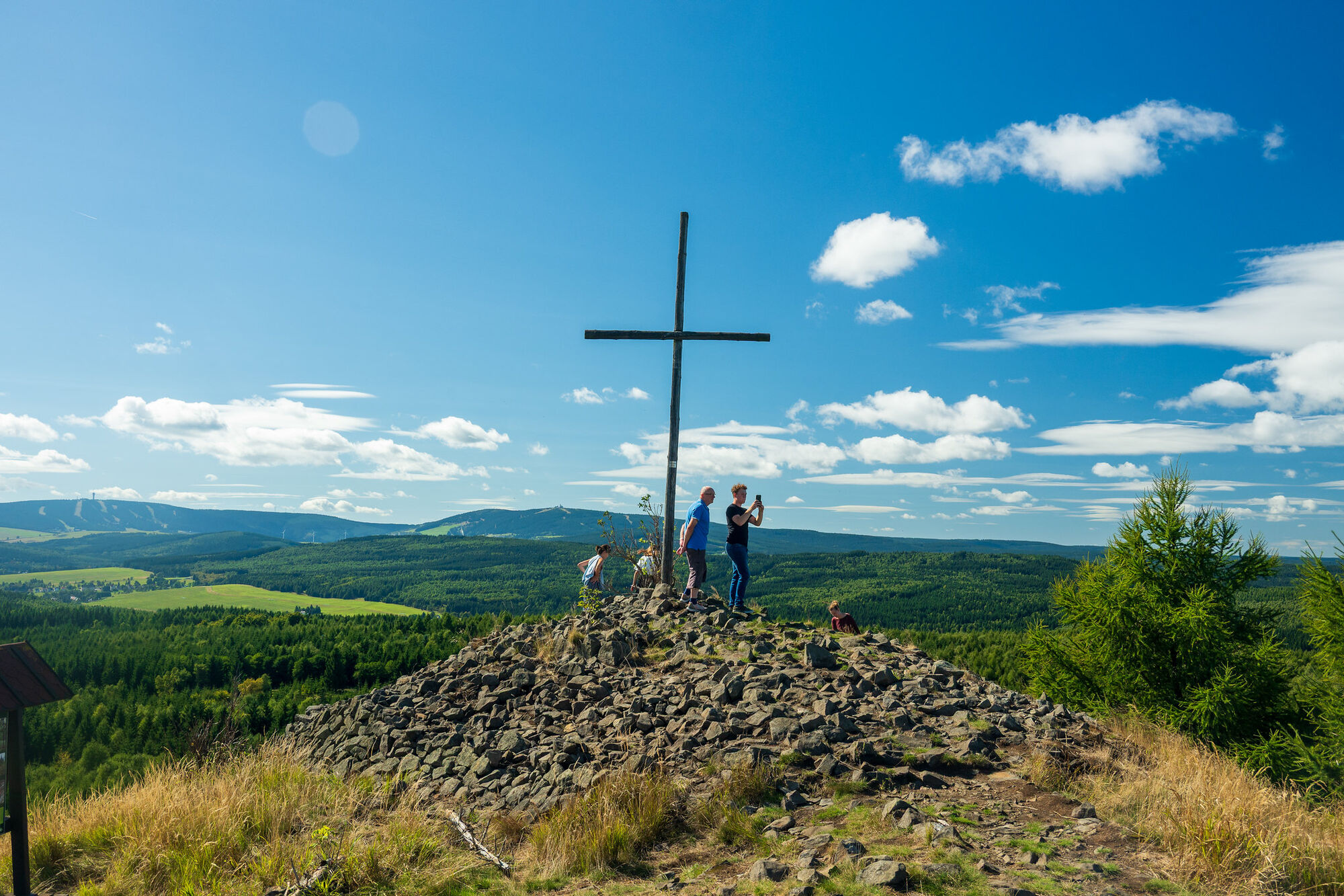 Wir starten unsere Wanderung am Parkplatz im Stadtzentrum. Wir gehen am Pilgerhaus der Krušné Hory vorbei, in dem sich eine zweisprachige Ausstellung über die wichtigsten Phänomene der Krušné Hory befindet. Das Gebäude war einst eine bekannte Fischkonservenfabrik, und die Ausstellung erinnert auch an diese Geschichte. Weiter geht es auf einer asphaltierten Seitenstraße in Richtung Velký Špičák, die in den Wald führt. Wir wandern auf einem schönen Waldweg, passieren zunächst den Aussichtspunkt auf dem Malý Špičák und steigen hinauf zum Středný špičák, von dem aus sich bereits ein herrlicher Ausblick bietet. Wir sehen zwei weitere markante Basaltknoten, die die Landschaft des Krušné Hory schmücken. Anschließend wandern wir durch einen jungen Wald zum Höhepunkt der Route – dem Velký Špičák. Am Fuße des Berges befindet sich ein kleiner Steinbruch. Von dort steigen wir steil bergauf, fast wie auf einen Alpengipfel. Ein kurzer, aber lohnender Aufstieg. Belohnt werden wir mit einem wunderschönen Panoramablick über das gesamte Erzgebirge. Hier liegt alles zu Ihren Füßen. Danach steigen wir auf demselben Weg unterhalb des Velký Špičák ab und wandern auf Waldwegen zum unteren Ende der Kovářská. Dort besichtigen wir die St.-Markus-Kapelle und erinnern uns an das Wunder, das ihrer Entstehung zugrunde liegt. Am Waldrand und über Wiesen gelangen wir zum Fußballplatz und von dort entlang des Friedhofs mit seinen schönen Gräbern zurück zum Platz. Hier können Sie sich in der Konditorei oder im Restaurant Horská Bašta stärken.