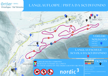 Solda has one of the highest lying cross-country skiing circuits in Europe. A height of 1,900 m is ideal for high level training. The overall length of the FIS approved cross-country ski circuit (skating and classical) is 7 km and it is open from November to April (illuminated at night).